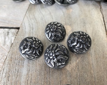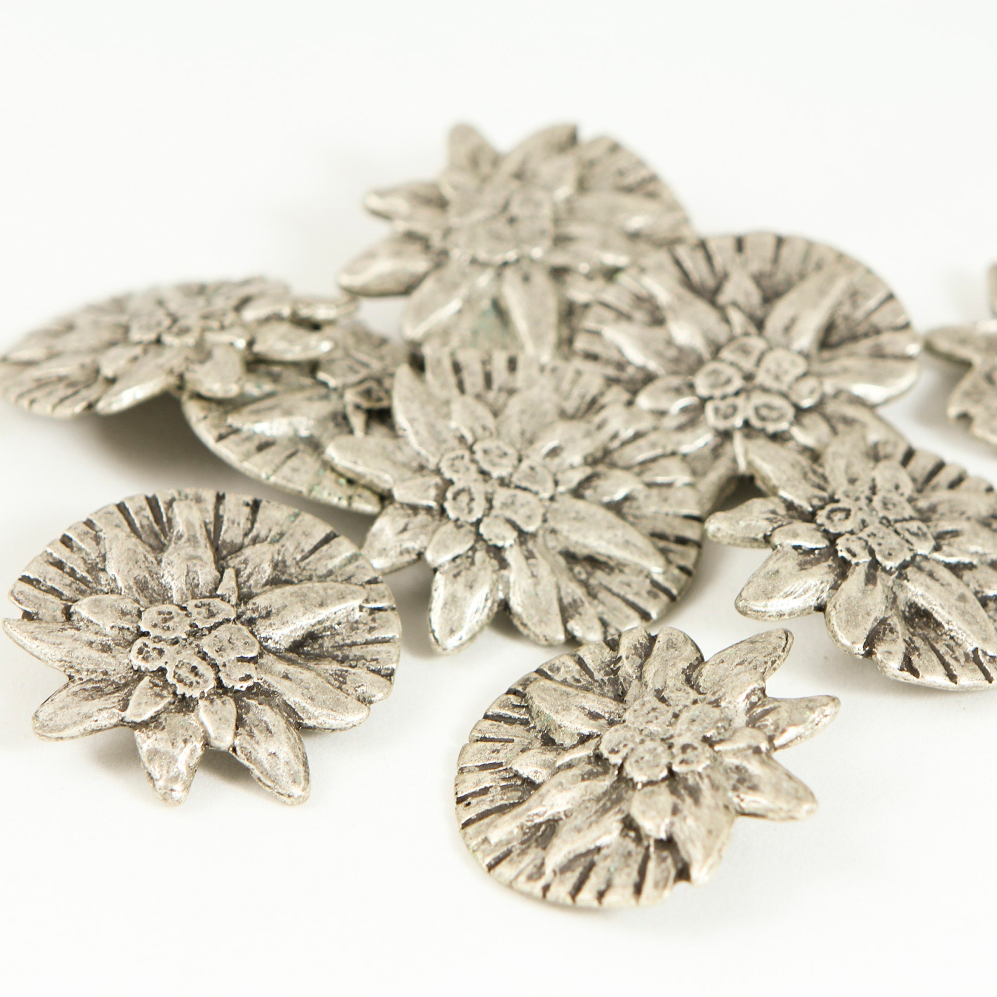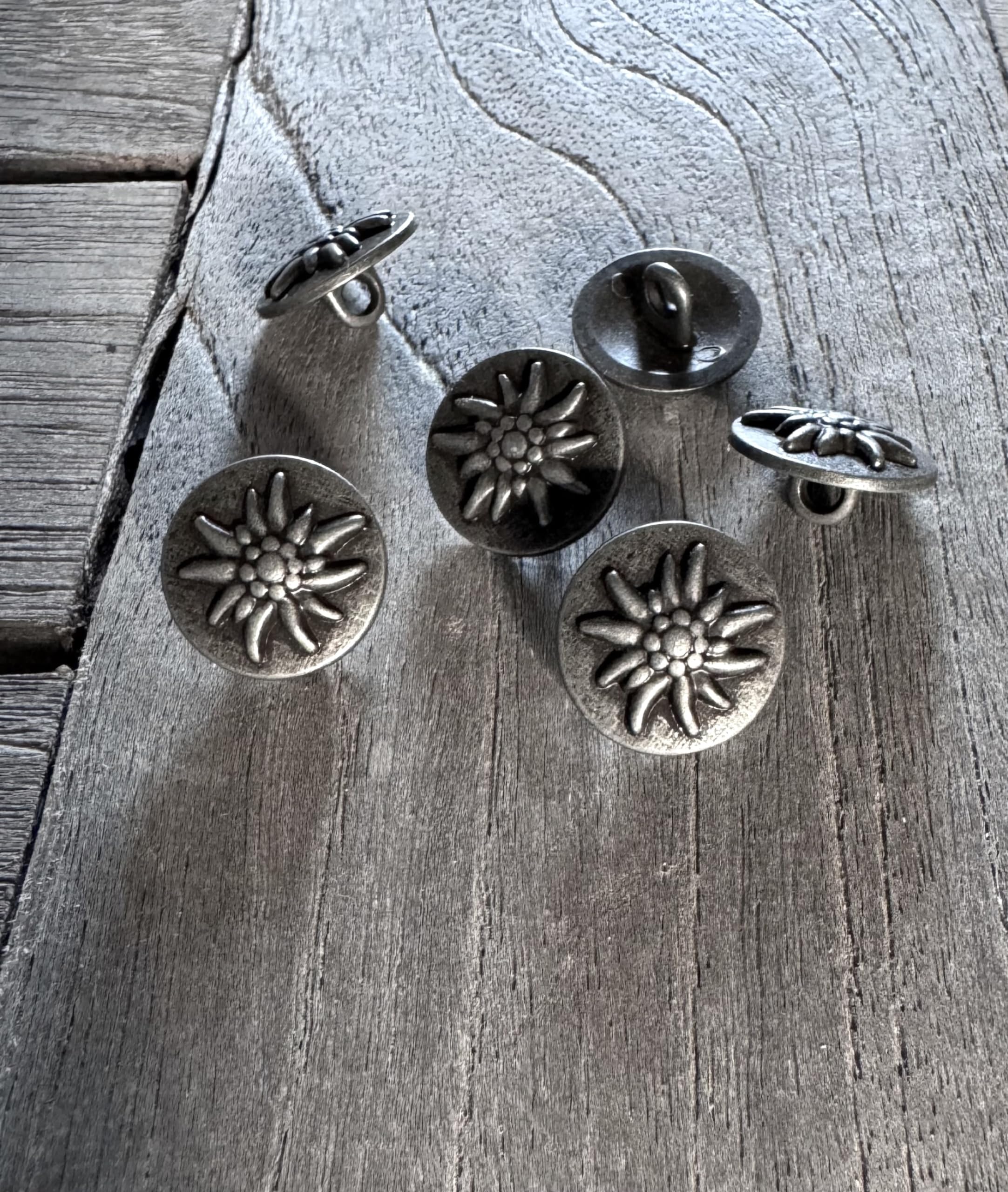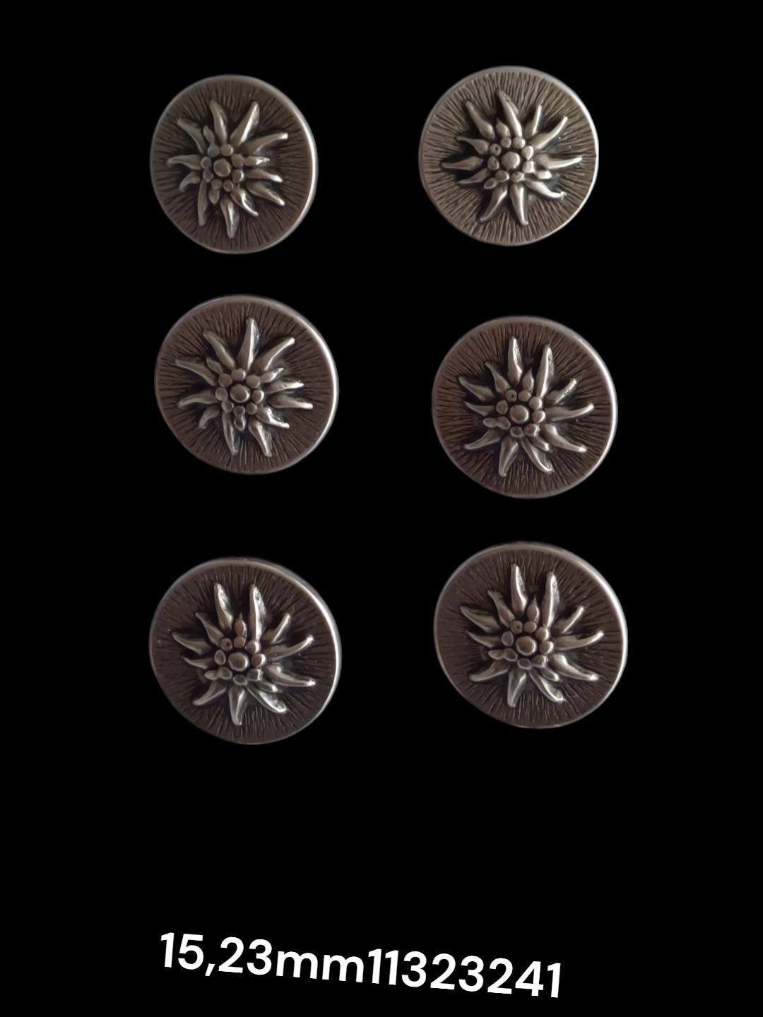 Boutons de qualité supérieure, entièrement en métal, couleur métal foncé, gris , Dimensions : environ 15 mm Toute l'inspiration mode et les dernières tendances sont en ligne sur SHEIN. Lot de 6 boutons métal fleur argent Superbe bouton à œillet en métal Edelweiss avec une couleur particulière Ce bouton est en métal argenté patiné de noir pour mettre en valeur les pétales de cette magnifique fleurs d'édeweiss. Un bouton unique qui viendra embellir... BOUTON DE MANCHETTE,16--Boutons Métalliques En Diamant De 16 MM, 10 Pièces-lot, Poignée De Boutons tendance de qualité supérieure avec motif edelweiss. Superbe coloris : gris/noir (plutôt mat) - Taille : 15 mm (cet article est également disponible en taille 22 mm)