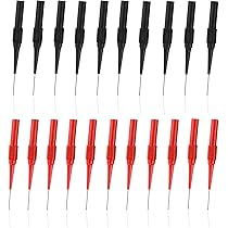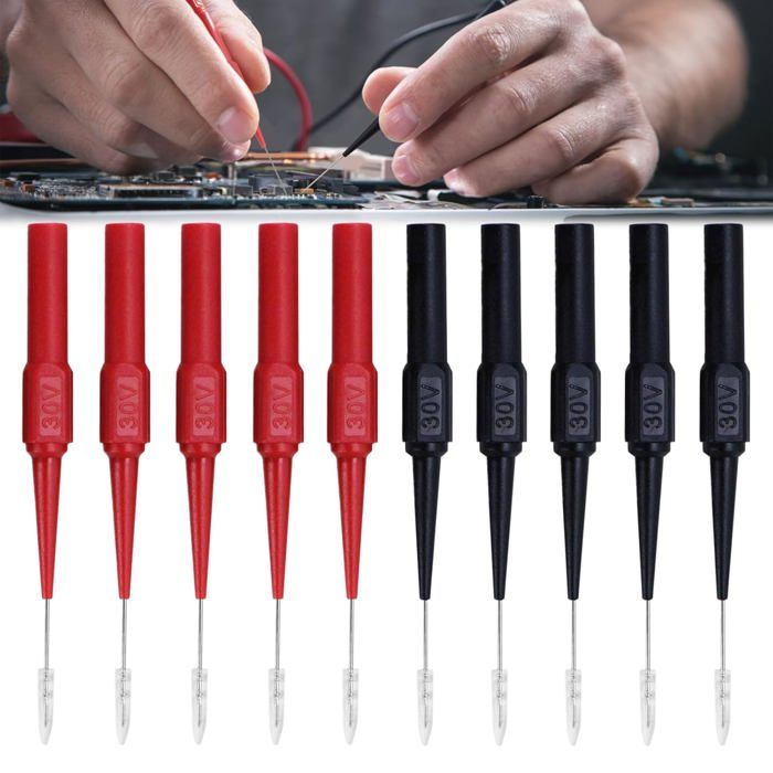 Avec une prise banane de 4 mm et des aiguilles de piercing isolantes amovibles de 0,7 mm, ces sondes de test sont idéales pour diagnostiquer les erreurs de voiture et mesurer la tension dans les circuits. 【sonde de test aiguille】 La pointe de mesure est en cuivre et en acier inoxydable de haute qualité pour assurer une longue durée de vie. Grâce aux pointes amovibles, les pointes de mesure sont faciles à nettoyer et à remplacer, ce qui les rend particulièrement pratiques pour une utilisation répétée. Sondes de test Fils de connexion, P5005 2pcs Entièrement isolé Quick Piercing Test aiguille Crochet Multimètre Sondes de test 4mm Socketmultimeter Kit de sonde de test professionnel pour multimètre, avec fil en silicone, pointe spéciale amovible, pour test de composants électroniques · Options d'achat et... Pince Crocodile Multimetre 15pcs Pinces De Test De Perage Sondes Sondes D'essai De Multimètre Sonde De Clip De Test Avec Prise De Banane Isolation Sonde De Test De Multimetre 07mm Sonde De Test Automobile 82846300 Sondes De Test Les pointes de mesure sont robustes et durables, offrant une grande précision pour mesurer la tension, le courant et d'autres paramètres électriques. Il convient à la vérification des connecteurs du faisceau de câbles et des capteurs du véhicule. 【sonde de test】 Il y a 5 embouts de test noirs et 5 embouts de test rouges. Les couleurs rouge et noire permettent une distinction rapide et facile entre les bornes positives et négatives. Vous pouvez les ranger dans votre sac à outils.