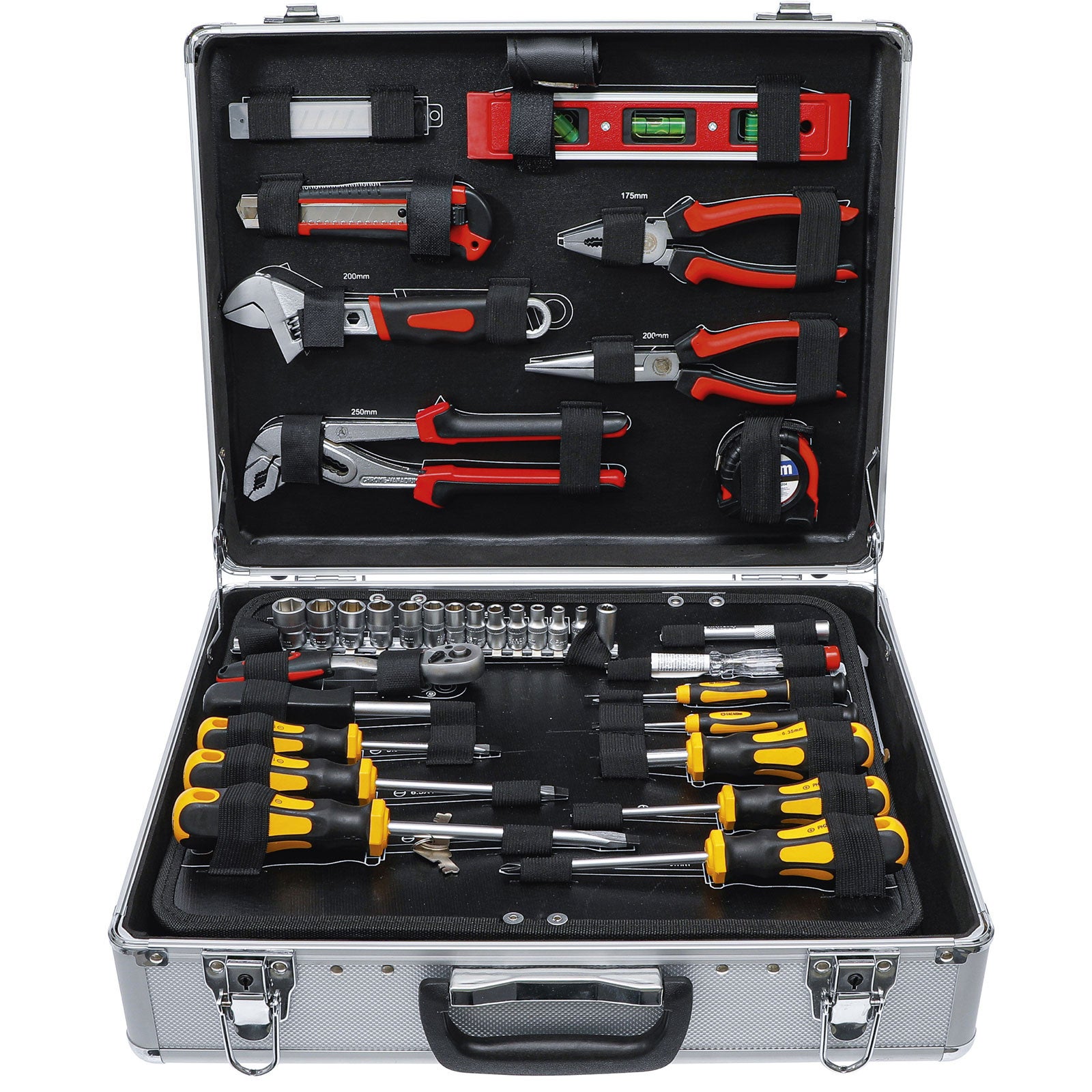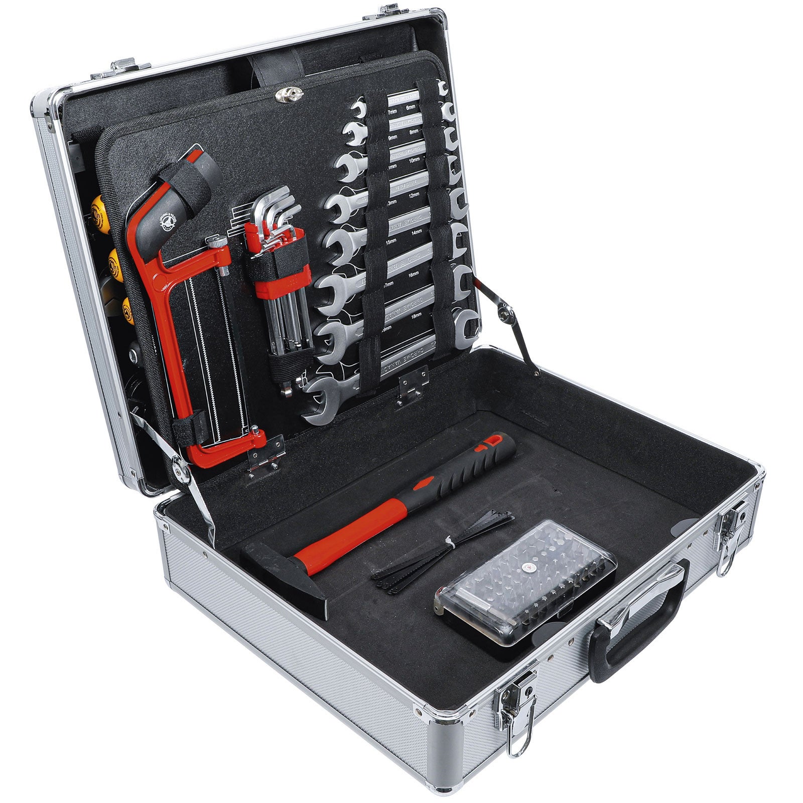 Phillips : 1 x 80 mm - 2 x 100 mm. Chiffres extra larges sur les douilles<br/MEILLEUR CONÇU : tout pour l'atelier, le garage et la maison, des tournevis, des douilles et des cliquets, en passant par le marteau de serrurier, les porte-embouts et les pinces 2 en 1<br/DÉTAILS DU PRODUIT : Dimensions : 460 x 320 x 140 mm (L x l x H) Poids : 8,8 kg DÉTAILS DU PRODUIT : Dimensions : 460 x 320 x 140 mm (L x l x H) Poids : 8,8 kg Phillips : PH0, PH1, PH2, PH3, PH4., Pozidriv : PZ0, PZ1, PZ2, PZ3, PZ4., Torx : T10, T15, T20, T25, T27, T30., Hexagonaux : 2 mm, 2,5 mm, 3 mm, 3,5 mm, 4 mm, 5 mm, 6 mm. Avec poignée de transport confortable pour un transport sans effort. Les bandes Velcro et élastiques assurent un maintien sûr des outils. Malette Outils Complete 8971490 109 PiècesMallette En Aluminium SolideKit MaisonLe Garage Et L Mallette Outils Leroy Merlin Chiffres extra larges sur les douilles, D TAILS DU PRODUIT Dimensions 460 x 320 x 140 mm (L x l x H) Poids 8,8 kg Chiffres extra larges sur les douilles 5 lames de rechange pour cutter sécable. Fente : 4,0 x 100 mm - 5,5 x 100 mm Insert en mousse EVA souple dans la partie inférieure de la valise. 1 mètre ruban de 5 m. 1 tournevis à cliquet avec porte-embout 2 en 1., 6 tournevis de précision. 6,35 mm : 4 mm, 4,5 mm, 5 mm, 5,5 mm, 6 mm, 7 mm, 8 mm, 9 mm, 10 mm, 11 mm, 12 mm, 13 mm. Contenu de la livraison : 1 marteau de serrurier de 200 g, avec manche en fibre de verre. 1 adaptateur d'embout de 25 mm. 2 crayons de charpentier de 175 mm. Mallette pratique : mallette en aluminium avec bords arrondis et protection des coins. 1 clé de réglage en acier 4 en 1., 1 pince multiprise 240 mm. 1 pince universelle de 180 mm. Cliquet avec poignée coudée. 1 niveau à bulle en aluminium de 200 mm. MEISTER Coffret à outils 44 pièces - Bricolage 1 scie à main de 150 mm. 1 cliquet réversible 9,53 mm (3/8), avec fonction de changement rapide, 72 dents. Porte-embout 2 en 1 pour une utilisation universelle avec double prise pour embouts et douilles. Insert intermédiaire pratique pour un rangement compact de l'outil Excellentes caractéristiques : les contours illustrés facilitent le tri de l'outil après utilisation. bois (3 pièces), métal (3 pièces)., 1 couteau sécable. Meister Boîte à outils 109 pièces Avec le boîtier de l'outil de 109 pièces de Master, vous obtenez un assortiment suffisamment positionné. Découvrez la variété d'outils à main de haute qualité - des tournevis sur des inserts de clé à douille et du craquelin, au marteau de serrurier, à la lampe et aux pinces. Que ce soit pour l'atelier, le garage ou le ménage: les produits... 1 rallonge de 9,35 mm (3/8), 75 mm. Équipement de base solide : assortiment d'outils compact rangé dans une valise, matériaux de haute qualité, équipement approprié pour tous les bricoleurs... 1 testeur de tension 125-250 V., 5 tournevis. 6 x 7 mm, 8 x 9 mm, 10 x 11 mm, 12 x 13 mm, 14 x 15 mm, 16 x 17 mm.