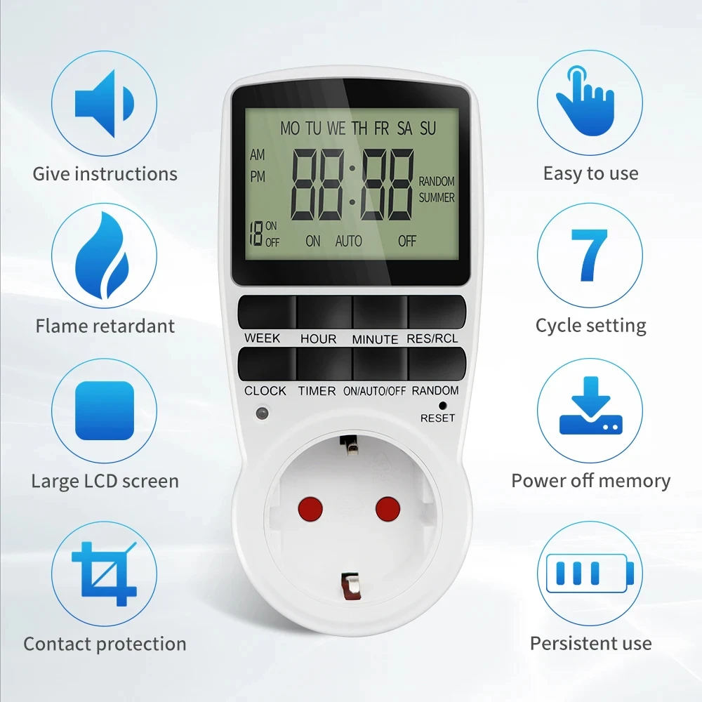 Très approprié pour l'éclairage domestique, les ventilateurs, les climatiseurs, les humidificateurs, les arbres de Noël et autres appareils électriques. FONCTION MINUTERIE DE COMPTE À REBOURS: En utilisant la fonction de minuterie de compte à rebours, vous pouvez définir un certain temps pour éteindre les appareils ménagers, économisant ainsi de l'énergie et des coûts. Spécification: Type d'élément: Interrupteur de prise de courant de minuterie Matériau: ABS Paramètres de chronométrage: 1 à 10 heures Méthode d'installation: plug-in Tension: 230V ~ / 50Hz Courant nominal: 16A Taille: env. Horloge Tableau électrique Commutateur De Prise De Courant De Minuterie, Prise De Prise Minuteur Compte à Rebours Tb35b Minuteur industriel Minuteur programmable / Interrupteur minuterie avec batterie,Trouvez les Détails sur Commutateur de minuteur avec batterie, Commutateur de minuteur de Tb35b Minuteur industriel Minuteur programmable / Interrupteur minuterie avec batterie - Yueqing Zhicheng Electrical Equipment Co., Ltd. Achetez Électronique Numérique Minuterie Interrupteur Programmable Calendrier Prise 230V/50Hz Cuisine Minuterie Sortie Temps Contrôle UE Plug sur Aliexpress... PARAMÈTRES DE BASE: 1 à 10 heures de paramètres de temps, tension 230V ~ / 50Hz, courant nominal 16A, environ 10,5 x 5,2 x 3 cm / 4,1 x 2 x 1,2 pouces. 6 réglages de compte à rebours différents : 6 réglages de compte à rebours différents peuvent être réglés librement pour répondre à vos différents besoins, tout ce que vous avez à faire est de brancher la prise du compte à rebours sur une prise de courant, puis de choisir le réglage que vous voulez 6 MINUTERIES DE COMPTE À REBOURS: Vous pouvez définir librement 6 paramètres de minuterie de compte à rebours différents, il suffit de brancher le produit dans la prise de courant, puis de sélectionner le paramètre souhaité pour répondre à vos différents besoins. 10,5 x 5,2 x 3 cm / 4,1 x 2 x 1,2 pouces Liste des packages: 1 x interrupteur de prise de courant de minuterie 1 x manuel de l'utilisateur RELAIS DE TEMPS Minuterie de commutateur intelligent Interrupteur de