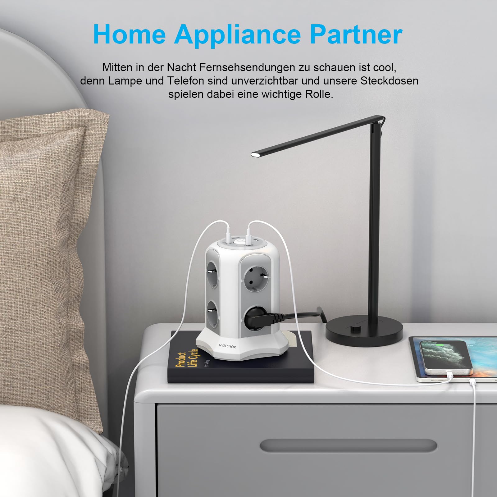 [8 Arten des Sicherheitsschutzes]NVEESHOX Multiprise ist CE/RoHS-konform,Sie verfügt über 8 Arten von Sicherheitsschutz:Kurzschluss-Schutz,Überlastungs-Schutz, Überspannungsschutz,Überstrom-Schutz, Schutz vor Überhitzung,Grounded Protection, Feuerfeste Hülle,Sicherhe