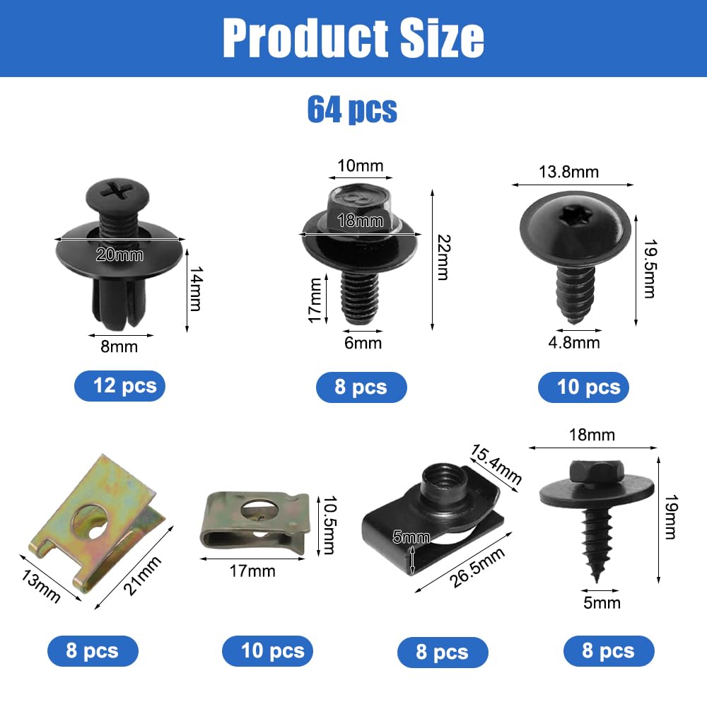 Hilitchi Assortiment de 64 écrous et vis en U pour voiture, y compris 4 tailles de clips d'écrous en U, clips de fixation de type U et fixations de panneau de corps de vis Pieces Auto Lot De 76 Pièces Assorties De Vis Pour Véhicules Et Automobiles U-Clips De Fixation En Métal Avec Vis Autotaraudeuses à Tête Hexagonale, Carrosserie, Panneau De Voiture, Vis Carénages, Boulons De Piéces Auto [Large application] Notre kit d'assortiment de clips en U et de vis est adapté à divers projets de serrage de panneaux de porte de tableau de bord, pour la garniture de porte, l'aile, le pare-chocs, le radiateur, l'empiècement de bouclier, la jupe latérale, la grille, le couvercle du moteur, etc. SURENHAP Clips de type U Assortiment d'écrous à clips en U pour voiture... Produits et équipements de massage orientaux, y compris les accessoires Montez vos projets électroniques avec cet ensemble de vis, écrous, entretoises et rondelles Velleman .L Vis écrou standard – Cazeneuve [Facile à utiliser] Vous avez juste besoin de glisser les clips de type U sur le bord du rail et de les verrouiller dans les trous pré-percés pour une fixation robuste. Contenu de l'emballage : vous recevrez 32 clips en U de 4 tailles (8 pièces pour chaque taille), 32 vis métalliques de 4 tailles (8 pièces pour chaque taille), 64 pièces au total.