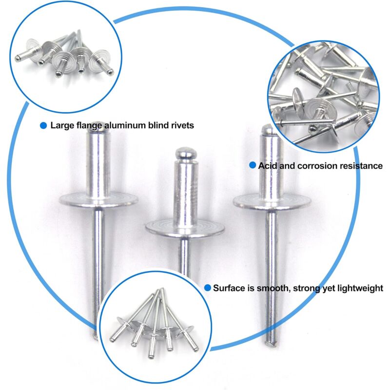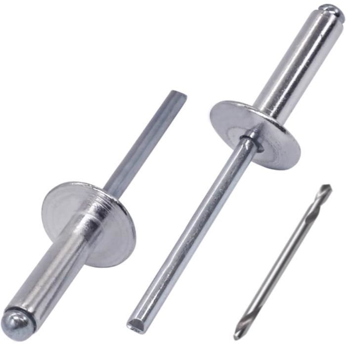 HENGBIRD Lot de 150 rivets aveugles en aluminium avec grande bride - 4,8 x 16 mm - Pour métal, plastique, bois Il est légèrement rond et son diamètre est deux fois plus grand que le diamètre du corps du rivet augmente le contact avec la plaque. Cela agrandit l'extrémité aveugle du rivet et le mandrin est cassé. Rivet Pop Tete Large 100 Pièces De Rivets Aveugles En Aluminium 4.8 X 10Mm, Rivets À Bout Rivet Blanc Sonoplay - Rivets Aveugle pour Matériaux Souples 4,8 x 16 mm RIVETS AVEUGLES POUR MATIERES SOUPLES (ALUMINIUM) Cette fixation assure une connexion sûre et ét C48174 - Lot De 20 Rivets Aveugles 5X25Mm À Tête Large 14Mm - Din 7337... Contenu de la livraison : 150 rivets pour aluminium de 4,8 mm x 16 mm x 16 mm (diamètre du corps de rivet x longueur du corps du rivet x diamètre de la tête du rivet) Les rivets avec une grande bride sont une solution de fixation fiable lorsque vous avez besoin de fixer un matériau souple ou cassant à un support rigide. La grande bride répartit la pression sur une surface beaucoup plus grande et aide à éviter la déformation de surface des éléments à fixer Convient pour les commerces, les automobiles, les trains, l'aviation, les pipelines, les ascenseurs, les conteneurs, les instruments, les meubles, etc. Qualité supérieure : les rivets aveugles en aluminium à grande tête sont fabriqués en aluminium de haute qualité, résistant à la corrosion, ne rouille pas facilement, a une bonne résistance à l'usure, une résistance aux vibrations, une bonne résistance aux chocs et une longue durée de vie. Rivet aluminium au meilleur prix | Leroy Merlin