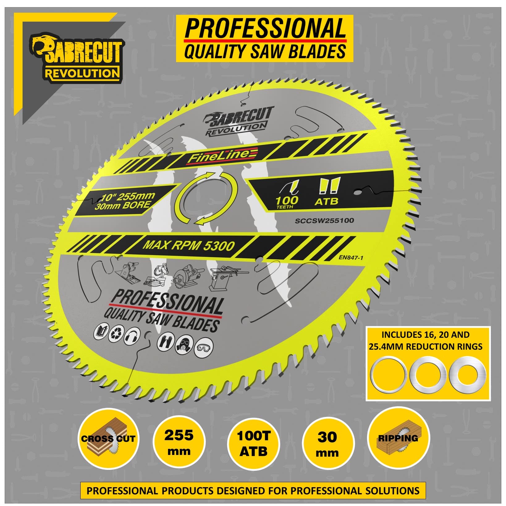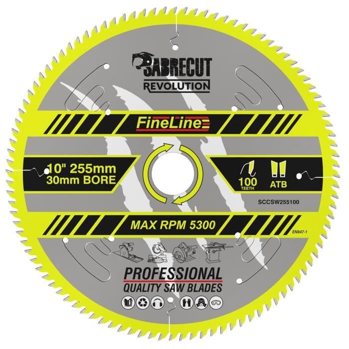 Taille de l'alésage : 30 mm., Nombre de dents : 100., Max RPM : 5300., Géométrie de broyage : ATB. Contenu de l'emballage : - 1 lame à bois de 255 mm 100T 30 mm d'alésage – SCCSW255100., SabreCut FineLine Lames de scie circulaire Les lames de scie circulaire SabreCut Revolution FineLine pour bois sont adaptées aux machines filaires et sans fil. Lame De Scie Carbure 1 Lame De Scie Circulaire SCCSW255100 SabreCut 255 Mm 100T X 30 Mm Lame Scie Circulaire 190x30 Ces lames sont idéales pour la coupe transversale lisse et la coupe de bois naturel et de feuilles de bois synthétiques telles que le contreplaqué, le MDF et l'aggloméré. Ces lames sont découpées au laser et comprennent des fentes anti-bruit et de vibration. Le kit comprend des bagues de réduction de 25,4 mm, 20 mm et 16 mm Les lames SabreCut FineLine sont dotées d'embouts en carbure d'origine allemande 20 % plus grands pour une longue durée de vie et une grande précision. Lame De Scie Circulaire Carbure Diamètre 255 Mm, Alesage 30 Mm Alesage 30mm 100 Dents Negatives Ep 3 SabreCut Les lames de scie circulaire Revolution nécessitent moins d'énergie des machines que les lames de scie standard Les lames sont découpées au laser et comprennent des fentes anti-bruit et de vibration Épaisseur de la plaque : 1,8 mm. Lame de scie industrielle et universelle. Pour une coupe de précision dans le bois et les panneaux de contre-plaqués. Ultima: Gamme supérieure avec un grade de... Lame scie circulaire au carbure ° 170 mm x 2.8mm 20 dents alésage 16mm SCID Le kit comprend des bagues de réduction de 25,4 mm, 20 mm et 16 mm. Caractéristiques : Senture fine pour des coupes plus droites avec reliure réduite Coupes transversales lisses et propres.