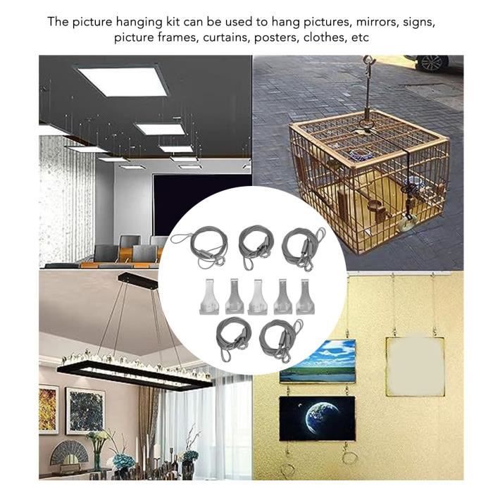 Kit : 4 câbles métalliques réglables de 1,5 mm x 2 m avec crochets 2 câbles métalliques à double anneau de 1,5 mm x 1,2 m Il suffit d'appuyer sur le régulateur à l'arrière du crochet et de tirer les câbles métalliques. 【Longueur réglable】 : le câble métallique en acier peut être ajusté à n'importe quelle longueur dans un rayon de 2 mètres. Largement utilisé] : le gréement réglable est adapté pour accrocher des cadres photo, des miroirs, des lustres, des décorations murales, des panneaux et diverses lampes de bricolage, ainsi que pour sécher les vêtements FHE-Fil de suspension pour tableau réglable avec crochet Kit de 5 Fils... Rail Rideaux Plafond Kit De Fil De Suspension Réglable Pour Photos – Câble En Acier Accroche Tableau Sans Percer 【Paquet】 : vous recevrez 4 câbles métalliques réglables en acier avec crochets (1,5 mm x 2 m) et 2 câbles métalliques en acier à double anneau (1,5 mm x 1,2 m). GIGIIS Câble Métallique en Acier Inoxydable 4 Pièces Fil de Suspension En outre, le crochet a une fonction coupe-vent. Le processus de réglage est simple. 【Largement utilisé】 : le gréement réglable est adapté pour accrocher des cadres photo, des miroirs, des lustres, des décorations murales, des panneaux et diverses lampes de bricolage, ainsi que pour sécher les vêtements.