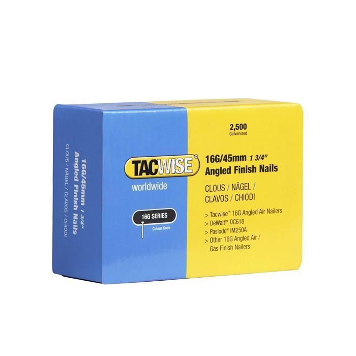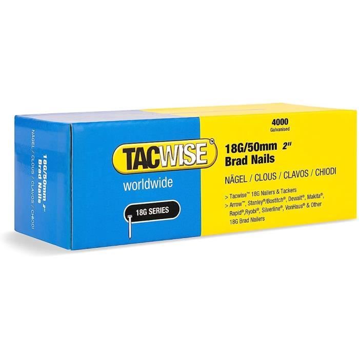 Boîte de 5000 clous de finition de type 18G L., 25 mm. Type : Clou de finition - Matière : Acier - Longueur : 25 mm - traitement : Galvanisé également utiles pour la thibaude, l'installation de magasin, l'installation des cuisine et d'autres applications de finition. Blade Runner Placo Tacwise 1711 Clous De Finition Brad Galvanisés De Type 18G / 30 Mm, Lot Clou Pour Cloueuse Pneumatique Pointes Tête Homme 18 GA Mini-Brads 1.2x20mm Finition Galva en boite de 5000 clous pour agencement En acier galvanisé pour une meilleure durée de vie. Parfaitement adaptés aux applications de finition en bois. également utiles pour la thibaude... Parfaitement adaptés aux applications de finition en bois. The TACWISE 0396 Type 18G / 25 mm Galvanized Brad Nails are a high-quality choice for various woodworking and finishing projects. Their durability, rust resistance, and consistent quality make them a reliable option for both professionals and DIYers Clou pour cloueuse et agrafe pour agrafeuse électrique : Boîte de 5000 clous de finition de type 18G L. Compatibles avec les cloueurs électriques et pneumatique Tacwise ainsi que beaucoup d'autres outils 18 GA., ., Clou pour cloueuse et agrafe pour agrafeuse électrique : Boîte de 5000 clous de finition de type 18G L. TACWISE Clous pour agrafeuse, 180/10 mm (18G/10), sans tête - Achat/Vente TACWISE 65900070
