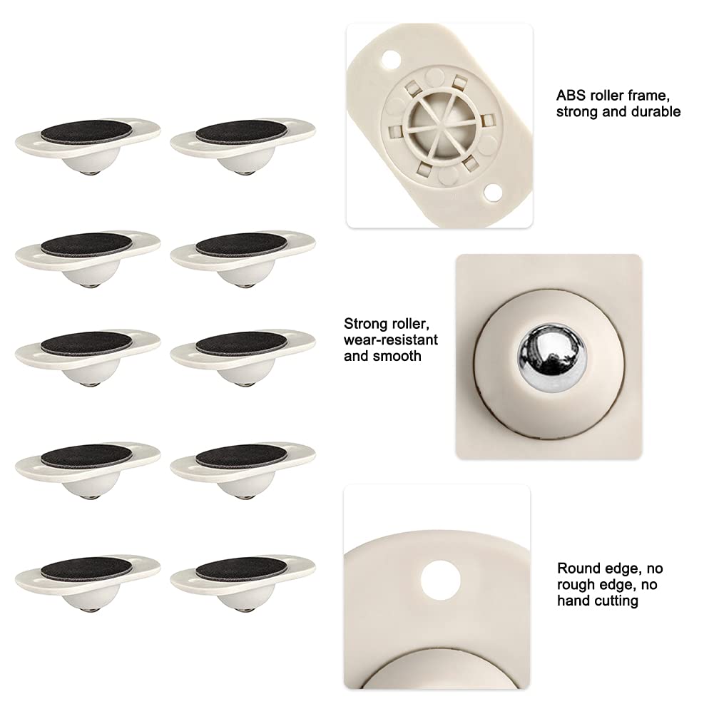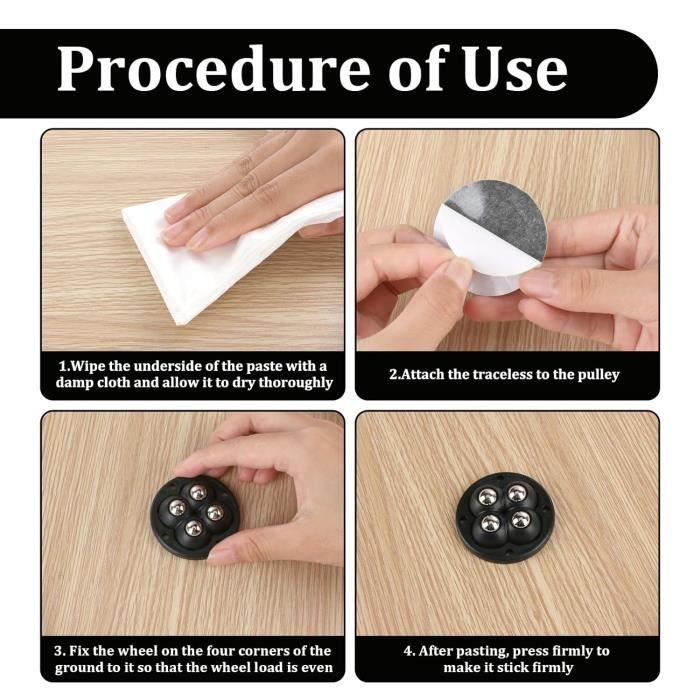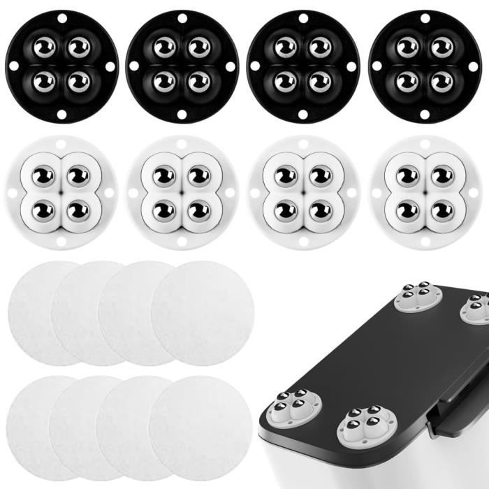 Spécifications du produit :Nom du produit : Ensemble de mini roulettes auto-adhésivesMatériel: ABS + Acier inoxydableCouleur : noirPoids : 486gListe de colisage:Roulettes auto-adhésives × 12Film × 12Plaquette de frein × 12Choses à noter :1., Assurez-vous que l'ensemble de petites roulettes pour meubles est installé dans la position appropriée et fermement fixé. ENSEMBLE DE 20 ROUES À ROULETTES PIVOTANTES - La coque des mini roulettes adhésives est fabriquée à partir de matériaux ABS de qualité supérieure avec des billes d'acier à l'intérieur qui les rendent les plus solides de leur catégorie.Quatre roues ensemble offrent une capacité de charge maximale de 11 livres.Vous pouvez également ajouter plus de roues selon vos besoins.ROTATION À... Matériaux de haute qualité : Les petites roulettes pour meubles sont fabriquées en acier inoxydable et en ABS, qui sont de haute dureté, résistants à l'usure, durables et ont une longue durée de vie. Roulette Placard Lot De 8 Mini Roulettes Universelles Adhésives Pivotantes à 360 Degrés Pour Mini Boîte De Rangement De Meubles (blanc Roulette Adhesive Robot Cuisine Large gamme d'applications : Les mini roulettes auto-adhésives sont polyvalentes et adaptées aux boîtes de rangement, machines à café et autres meubles, ce qui facilite le déplacement des meubles. Mini roulettes Rotation à 360 degrés rouleaux auto-adhésifs en acier inoxydable curseur d'appareil pour bacs de rangement petits meubles 4 pièces Points de... Pte Roue Universelle Mini Roulettes Adhésives 360 Degrés De Rotation Rotation à 360 degrés : Les roulettes auto-adhésives utilisent des billes d'acier métalliques mobiles à 360 degrés pour se déplacer facilement sans obstruction et sans impasse. S'il n'est pas installé dans la bonne position, la poulie peut perdre le contrôle ou glisser de manière instable., 2., Vérifiez régulièrement l'état de la combinaison roue meuble et effectuez l'entretien nécessaire., Comment utiliser :1., Choisissez un emplacement approprié sur le meuble pour installer le film., 2., Retirez le film et collez les roulettes., 3., Poussez et fixez la plaquette de frein sur le côté du rouleau.