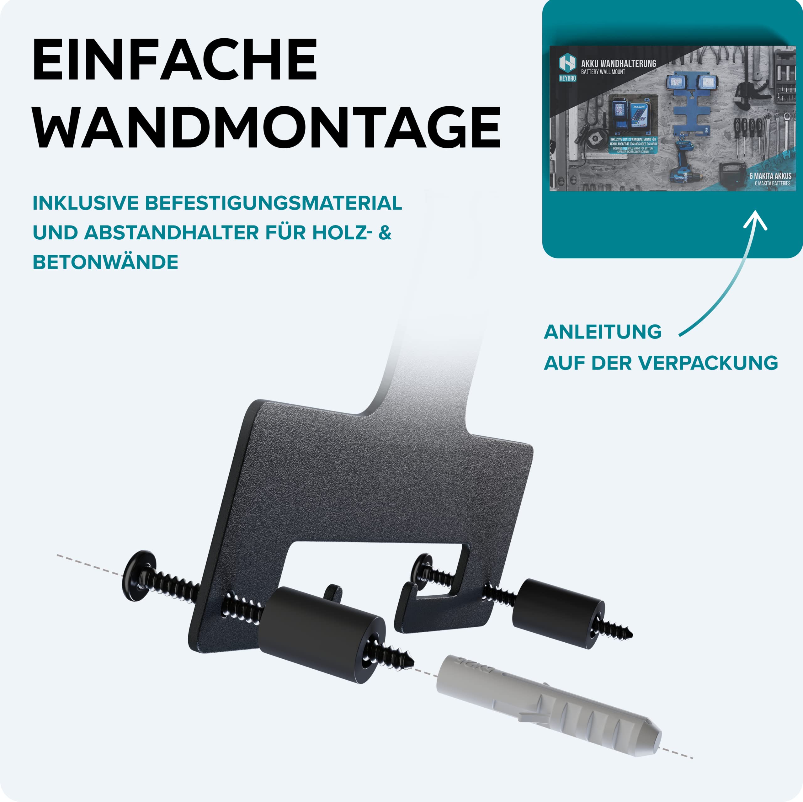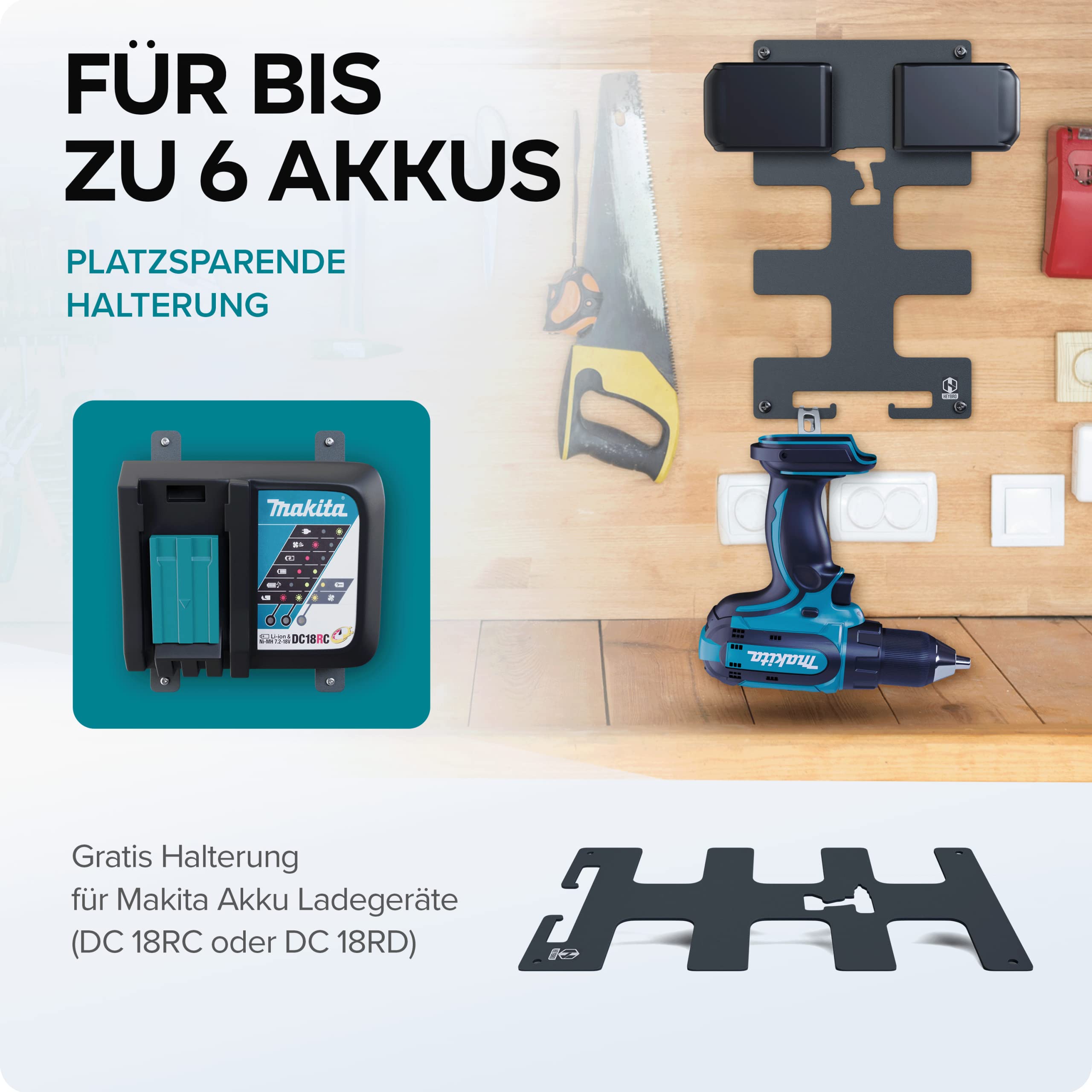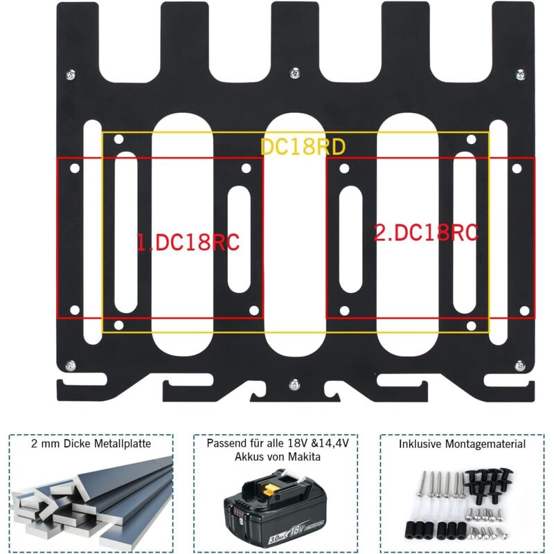 Les instructions de montage, avec images et texte, permettent une pose en quelques minutes. Propre et ordonné : ce support mural 3 en 1 pouvant accueillir jusqu'à 4 batteries (14,4 V et 18 V) s'insère par le haut dans les rainures parfaitement... Power Pack 18V LXT 1x3,0 Ah et chargeur - MAKITA 1XBL1830B DC18RC Facile à installer : ce kit comprend toutes les vis, chevilles et entretoises nécessaires au montage. 3 En 1 Riuog Support Mural Pour Batteries Et Chargeurs Makita – Support Stable De 2 Batteries Pour Batterie 18 V 14,4 V, Support De Chargeur DC18RC – Convient Pour Atelier Et Garage Support Batterie Makita Facile à installer : ce kit comprend toutes les vis, chevilles et entretoises nécessaires pour le montage. Les instructions de montage, avec images et texte, permettent une installation en quelques minutes Facile à utiliser : avec ce kit de support optimisé, composé d'un support mural pour jusqu'à 6 batteries Makita (14,4 V et 18 V) et jusqu'à 2 visseuses sans fil, ainsi qu'un support pour un chargeur Makita (DC18RC+RD), il est enfin de l'ordre dans l'atelier Facile à utiliser : les supports muraux sont fabriqués en tôle de 3 mm d'épaisseur et sont ensuite recouverts d'un revêtement en poudre anthracite, ce qui garantit une utilisation à long terme et sans rayures, que ce soit dans une cave amateur ou un atelier de chef-d'œuvre