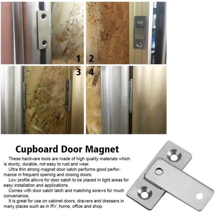 4PCS Aimant pour Porte Placard Loquet de Porte Magnétique Fermeture de Épaisseur : 2 mm ; diamètre de la tige : 7 mm. Ses ferrures magnétiques vous permettront de verrouiller la porte, l'armoire et ainsi de suite, pratique à... MroMax Lot De 3 Loquets Magnétiques Pour Porte En Verre Magnétique élevé pour maintenir la porte d'armoire, la porte de meubles, la porte de garde-manger, les portes françaises et les portes 2. Idéal pour une utilisation dans les chambres, salles de bains, cuisines, camping-cars et placards