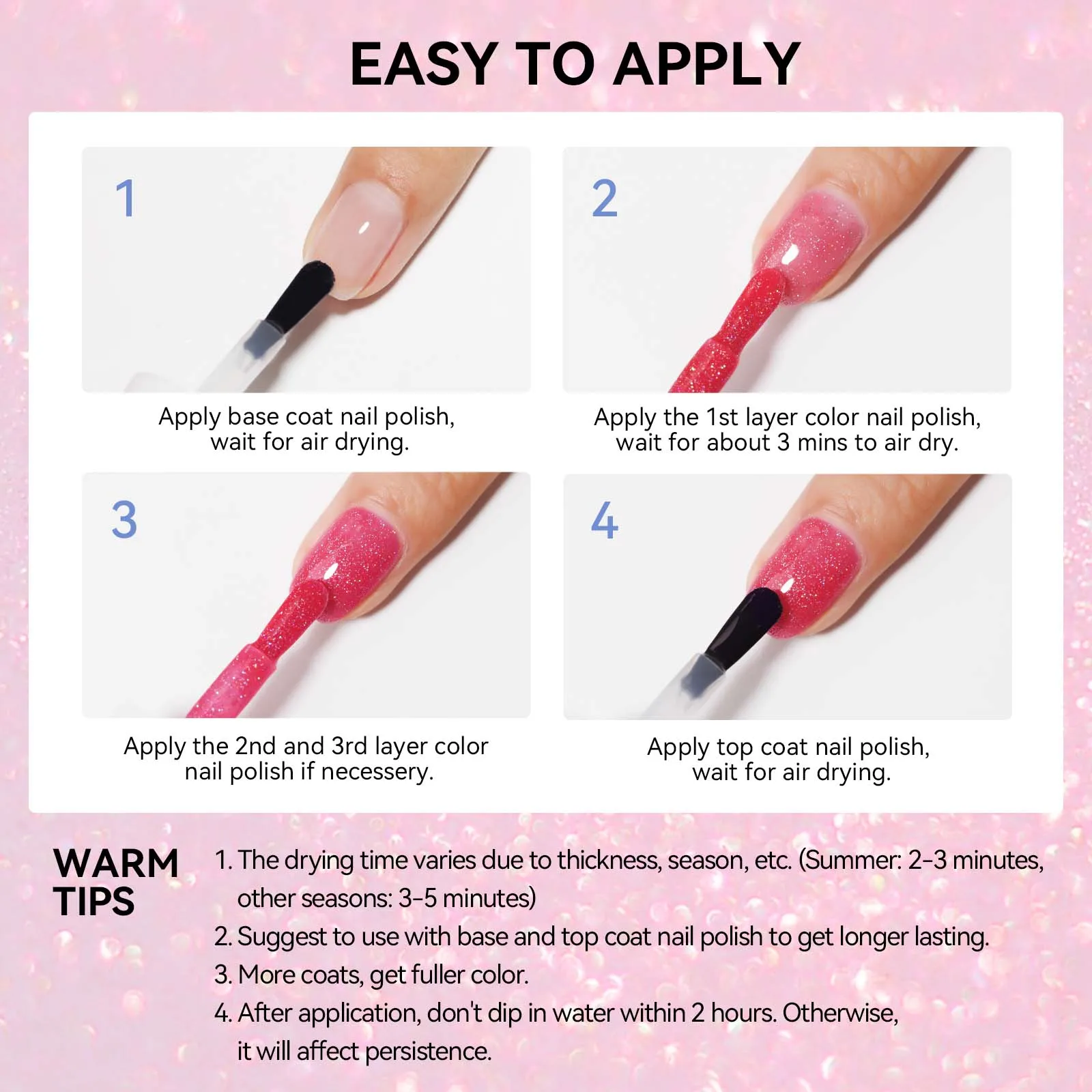 Description du produit Vernis à ongles Mizhse, choisissez parmi 8 couleurs différentes, tout ce que vous pouvez imaginer. Séchage rapide, 1 à 2 minutes en été, et 2 à 3 minutes en d'autres saisons, grâce à la formule à séchage rapide. Profitez d'un temps de séchage instantané, ce qui en fait un choix parfait pour les personnes en déplacement Vernis à Séchage Rapide : Analyse et Comparatif des Meilleurs Produits pour des Ongles Parfaits - Moi Jebara Ingles Laissez libre cours à votre imagination Résultat un look expressif en quelques minutes et des résultats de couleur optimaux et opaques après deux couches de vernis à ongles. Vernis à ongles blanc, rose, rose rouge, marron, jaune, orange, vert, bleu, couleur néon. Aucune LED UV requise, facile à appliquer et séchage rapide, aucune lampe LED UV requise. Conseils chaleureux : vous devez sécher la surface de vos ongles avec un tampon imbibé d'alcool avant l'application afin qu'il ne reste pas de graisse et affecte la durabilité de vos ongles Il ny a pas de limites à votre imagination., Formule spéciale. Conseils Mode d'emploi Se préparer les ongles, appliquer une base, appliquer le vernis à ongles en couches fines, attendre un temps de séchage adéquat entre chaque couche et terminer avec un top coat. Vernis Semi Permanent Jaune Pastel MIZHSE Vernis à Ongles Miroir Argenté Métallisé, Séchage Rapide Vernis Jaune Pastel Semi Permanent MIZHSE Vernis à ongles à séchage rapide, jaune gelée, à base d'eau, formule longue durée, séchage rapide, 1 x 15 ml. 3,5 étoile(s) sur 5 44. 1 offre à partir... Vernis jaune pastel - Vernis séchage rapide - Busy beeline