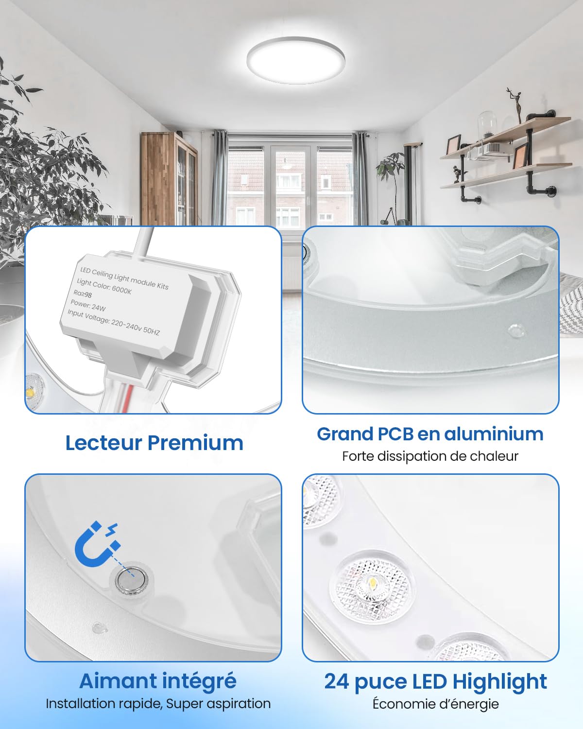 [Super Lumineux] : Ce kit de lumière de rechange LED a été conçu avec 24 puces LED lumineuses, les LED de haute qualité se répartissent uniformément autour du panneau, avec une lumière naturelle de 4000K et la lentille optique, la répartition de la lumière est parfaite, adaptée aux pièces de 12㎡ à 15㎡. Multifonction: Module LED de remplacement parfait pour ventilateur de plafond, faisceau de plafond, lampe fluorescente T9 et plus encore. L'éclairage blanchâtre... [Applications] : Ce panneau lumineux LED rond de rechange est bon pour la mise à niveau ou le remplacement de votre ventilateur de plafond, lampe fluorescente T9, lampe suspendue, éclairage de chambre à coucher, couloir de cuisine et ainsi de suite pour remplacer les ampoules à incandescence, halogènes et lampes CFL. Il a une meilleure performance de dissipation de la chaleur, ce qui permet une durée de vie plus longue que les autres ampoules LED; il est construit pour durer 25000 heures, 2 fois plus longtemps que les CFL (2500 heures). Blooming Gel DoRight 24W Módulo De Anillo LED, Con Soporte Magnético Blanco Frío 6000K, Juego De Conversión Para Lámparas De Techo Y Lámparas De Pared, Repuesto De Lámpara Fluorescente Circular Otoscope Oreille Plafonnier LED Hublot Rond - 300 Mm - 20W - 4000K - Blanc Naturel Detecteur Ir Ip65 93966736 [Support Magnétique, Facile à Installer] : Avec les aimants intégrés, il peut être fixé directement à la base métallique et simplement connecter le fil à notre connecteur, aucun outil nécessaire. Remarque : convient aux plafonniers dont le châssis est en fer.