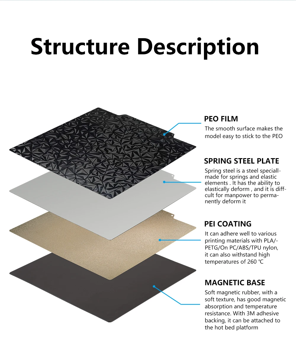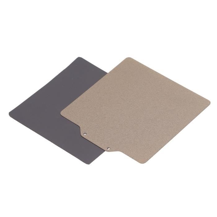 * Facile à enlever et à utiliser : la tôle d'acier à ressort de cette plaque de construction est flexible et peut être facilement pliée pour enlever le modèle imprimé sans avoir besoin d'outils supplémentaires. La plaque retrouvera sa planéité après utilisation. Matériau : plaque d'acier à ressort., * Dimensions : 230 x 230 mm., Couleur : doré, noir. Tolérature haute température : résiste à des températures allant jusqu'à 150 °C et 300 °C respectivement, cette plaque de construction prend en charge une large gamme de types de filaments pour divers besoins d'impression. Caractéristiques : * Plaque de construction fiable : cette plaque de construction est fabriquée en tôle d'acier à ressort PEO + PEI à 2 faces, avec 1 face revêtue pour le film PEO et l'autre côté avec texture pour PEI. *Résistance aux hautes températures et filaments compatibles : le lit d'impression résiste à des températures élevées jusqu'à 150 °C, tandis que le plateau texturé pour revêtement PEI peut résister à des températures allant jusqu'à 300 °C. Imprimantes 3D compatibles] Le lit d'impression PEO lisse double face PEI texturé adapté aux imprimantes 3D avec une taille de plate-forme de 184 x 184 x 184... Veuillez vous assurer de confirmer la taille de la plate-forme de votre machine avant de la choisir. Cela le rend compatible avec une large gamme de filaments. Même les débutants peuvent facilement imprimer sans se soucier du détachement du modèle. Retrait facile du modèle : l'acier à ressort flexible vous permet de plier sans effort la plaque pour libérer vos impressions sans aucun outil, la redonnant à la planéité avec facilité après chaque utilisation. Fdit Plaque de construction d'impression 3D Acier à Ressort en Plaque De Construction Magnétique Double Face PEI En Acier 230 X *Excellente adhérence pour la première couche d'impression : cette plaque de construction assure une excellente adhérence, permettant au modèle de se fixer fermement à l'endroit du lit d'impression.