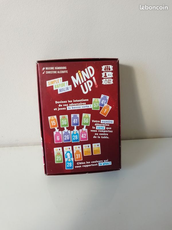Description du produit Mind Up - Catch Up Games - Jeu de société - Jeu de Cartes - 8 Ans et Plus - 3 à 6 Joueurs - Simple et Malin - Version française - Ambiance Garantie en Famille ou Entre Amis Avertissement De Sûreté Ne convient as aux enfants de moins de 36 mois Si cette simplicité apparente permet de jouer rapidement, ce jeu laisse place à suffisamment de tactique pour permettre à chacun de progresser et tenter de gagner la partie. La carte que vous gagnez rejoint votre zone de score, en fonction de sa couleur. Jeux De Société Adulte Sobek - 2 Joueurs - Catch Up Games - Jeux De Société - Catch Up Games Speed Bac Jeu Mind Up - Catch Up Games - Jeu de société - Jeu de Cartes - 8 Ans et Plus - 3 à 6 Joueurs - Simple et Malin - Version française - Ambiance Dans ce jeu de cartes aussi simple que malin, devinez les intentions de vos adversaires pour gagner la carte que vous convoitez au centre de la table : l'ordre des numéros joués secrètement par vous et vos adversaires détermine quelle carte chacun remporte ! À chaque tour, tout le monde joue simultanément une carte de sa main pour tenter de récupérer celle qui l’intéresse au centre... ⚡️SIMPLE, RAPIDE, MALIN : Dans ce jeu de cartes aussi simple que malin, deviner les intentions de vos adversaires pour gagner la carte que vous convoitez au centre de la table : l'ordre des numéros joués secrètement par vous et vos adversaires détermine quelle carte chacun remporte ! The Loop - Jeux de société - Catch Up Games 👨👩👦👦3 à 6 joueurs🎂 8 ans et plus ⏱20 minutes de jeu environ Mettez la main sur les couleurs associées à vos valeurs les plus élevées pour l’emporter. Jeu de cartes Mind Up - BLACKROCK - Pour 3 joueurs ou plus - A partir de 8 ans - Jeux - Jouets