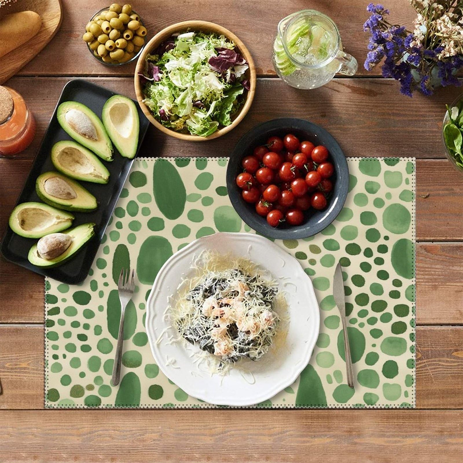 Fabriqué à partir d'un mélange exquis de fibres de PVC et de polyester, notre tapis d'assiette en PVC offre une durabilité exceptionnelle et est conçu pour résister aux rigueurs d'une utilisation quotidienne. Utilisation polyvalente : idéal pour toute occasion de salle à manger, ces sets de table en PVC résistants à la chaleur protègent votre table et améliorent votre décoration, que ce soit dans la cuisine ou la salle à manger. Sets de table ronds antidérapants blancs à pois verts pour table de salle à manger, décoration de cuisine, 38,1 cm ; 1 Piece. €4.46 ; 4 Pieces. €12.50 · €3.13... Que vous organisiez un dîner, que vous profitiez d'un repas en famille ou que vous recherchiez simplement une touche d'élégance quotidienne, ces sets de table de salle à manger ne manqueront pas d'impressionner. Ils peuvent être découpés à n'importe quelle taille ou forme pour s'adapter parfaitement à votre table, sans ourlet grâce à leurs bords qui ne s'effilochent pas. Un côté de ce set de table en PVC dispose d'une impression vibrante et en couleur qui apporte vie et personnalité à votre table. Pour ceux qui aiment personnaliser leurs accessoires de maison, vous apprécierez la possibilité de personnaliser ces sets de table. Ajustement personnalisé : coupez nos sets de table à la taille unique de votre table sans les tracas de l'effilochage des bords. L'envers reste une couleur blanche fixe, offrant une polyvalence et un look épuré et classique qui convient à tout décor. Nos sets de table ronds sont plus qu'un simple essentiel pour la salle à manger, ils sont une déclaration de style. Lot de 4 sets de table lavables résistants à la chaleur et Set De Table Vert Original Antidérapant Lavable Sets De Table IPEA 45x30cm - 6 Pièces, PVC Lavable, Anti-Taches, Antidérapant, Beige Tovagliette Americane Set De Table Vert Extérieur Entretien simple : nos sets de table sont lavables sans effort, assurant une expérience de repas propre à chaque fois.