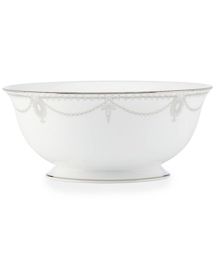Evoking the intricately beaded of a Marchesa, the Marchesa Pearl Wine Oval Platter est monté à la main en perles brillantes au fond du vin. Avec perles blanches et motif de dentelle platine , Passe au lave-vaisselle Mesure une longueur de 45 cm , Fabriqué aux États-Unis Lenox Marchesa Empire Plat Ovale, Perle Avec sa précieuse platine motif et relief émail accents, Empire Pearl a été inspirée par les perles aux détails complexes trouvés dans les modes à marchesa