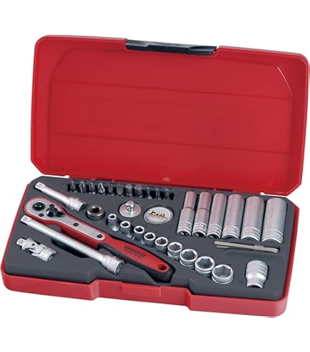 Avec embouts hexagonaux 3/8, pour trous intérieurs, chrome vanadium, finition mate., Dimensions : 3,2 mm , Avec embouts hexagonaux 3/8 , Longueur : 49,5 mm Malette de douilles 1/4 AF de 35 pièces : Tengtools : Clé à cliquet et Tailles : 3/32 1/8 5/32 3/16 7/32 1/4 5/16 3/8 Fabriqué en acier au chrome vanadium avec une finition satinée pour une meilleure adhérence dans les environnements huileux Fourni sur un rail de serrage (165 mm de longueur) complet avec 8 clips de douille 3/8 Garantie à vie Voir plus de détails Teng T1435AF Lot De Douilles 6,3 Mm 35 Pièces Clé à douille hexagonale réglable à entraînement de 3/8 pouces clé...