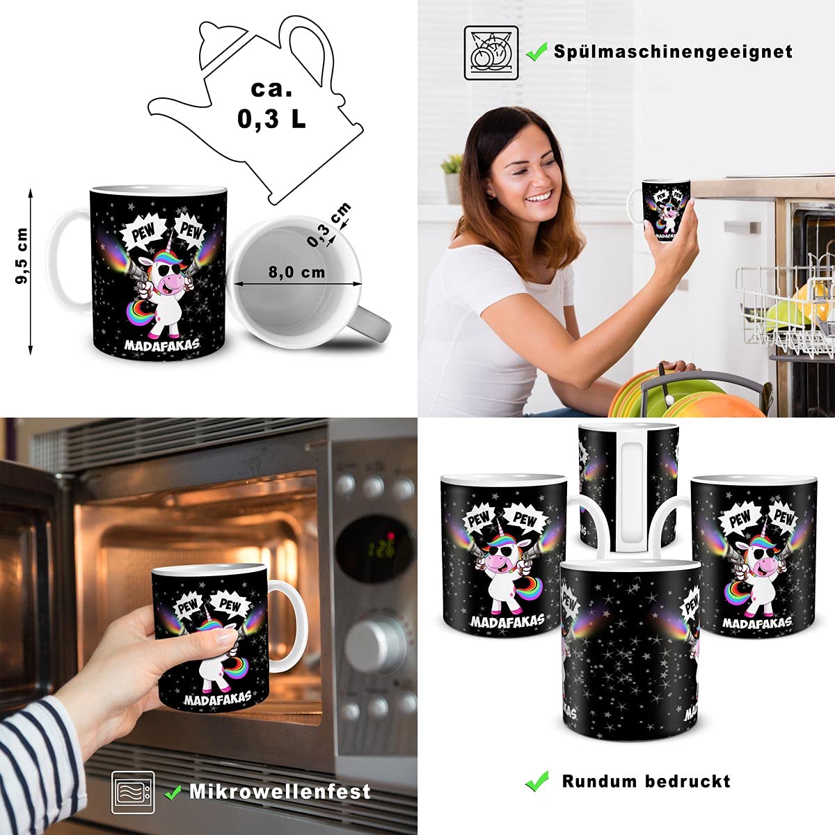 La marchandise va directement de nous à vous. Les motifs imprimés ne se décolorent pas et ne s'écaillent pas Caractéristiques de la tasse imprimée : Mug avec motif original Les motifs sont créés numériquement, puis imprimés à la main par sublimation sur les tasses. Des cadeaux personnalisés et amusants pour presque toutes les occasions.La tasse est imprimée de qualité supérieure, a une capacité de 330 ml, passe au lave-vaisselle, au micro-ondes et a un diamètre de 80 mm et une hauteur de 96 mmLes tasses sont imprimées exclusivement en Allemagne TRIOSK Tasse Licorne Tirante Avec Inscription Amusante Pew Pew Madafakas - Cadeau De Bureau Pour Hommes, Femmes, Amateurs De Licorne - Noir La capacité maximale est de 330 ml Grâce à l'impression recto-verso, les droitiers et les gauchers apprécient nos motifs. Impression colorée même après 3000 lavages avec revêtement Orca La marchandise va directement de nous à vous Tasse en céramique de qualité supérieure : profitez de votre café du matin avec cette tasse en céramique de qualité supérieure. La poignée classique en C tient bien dans la main et offre un maintien sûr. Fabriqué en Allemagne – Nos articles sont produits au cœur... Dimensions : les dimensions de la tasse sont d'environ 8 cm de diamètre pour une hauteur de 9,5 cm et un poids d'environ 350 gr. La poignée classique en C tient bien dans la main et offre un maintien sûr. Le matériau passe au lave-vaisselle et au micro-ondes et résiste à la chaleur. Drôle De Licorne Alpha Licorne Meme Mâle Hommes Mâle Tasse Tasse en céramique de qualité supérieure : profitez de votre café du matin avec cette tasse en céramique de qualité supérieure. Nos tasses ont été revêtues par Orca Coatings et vous garantissent des motifs de haute qualité même après 3 000 lavages au lave-vaisselle. Les designs sont créés numériquement puis à la main par Impression par sublimation sur les tasses. Ne vous inquiétez pas des couleurs qui s'estompent, des motifs flous ou même des fragments de couleurs écaillés : Le revêtement d'origine Orca Coatings garantit une couleur longue durée même après 3 000 lavages au lave-vaisselle. Pas de production de masse, pas d'importation. Fabriqué en Allemagne - Nos articles sont produits au cœur de la Ruhr. Si vous avez encore des questions sur nos produits ou si une livraison ne correspond pas à vos idées, nous sommes à votre disposition par téléphone et par e-mail avec des conseils et des actes