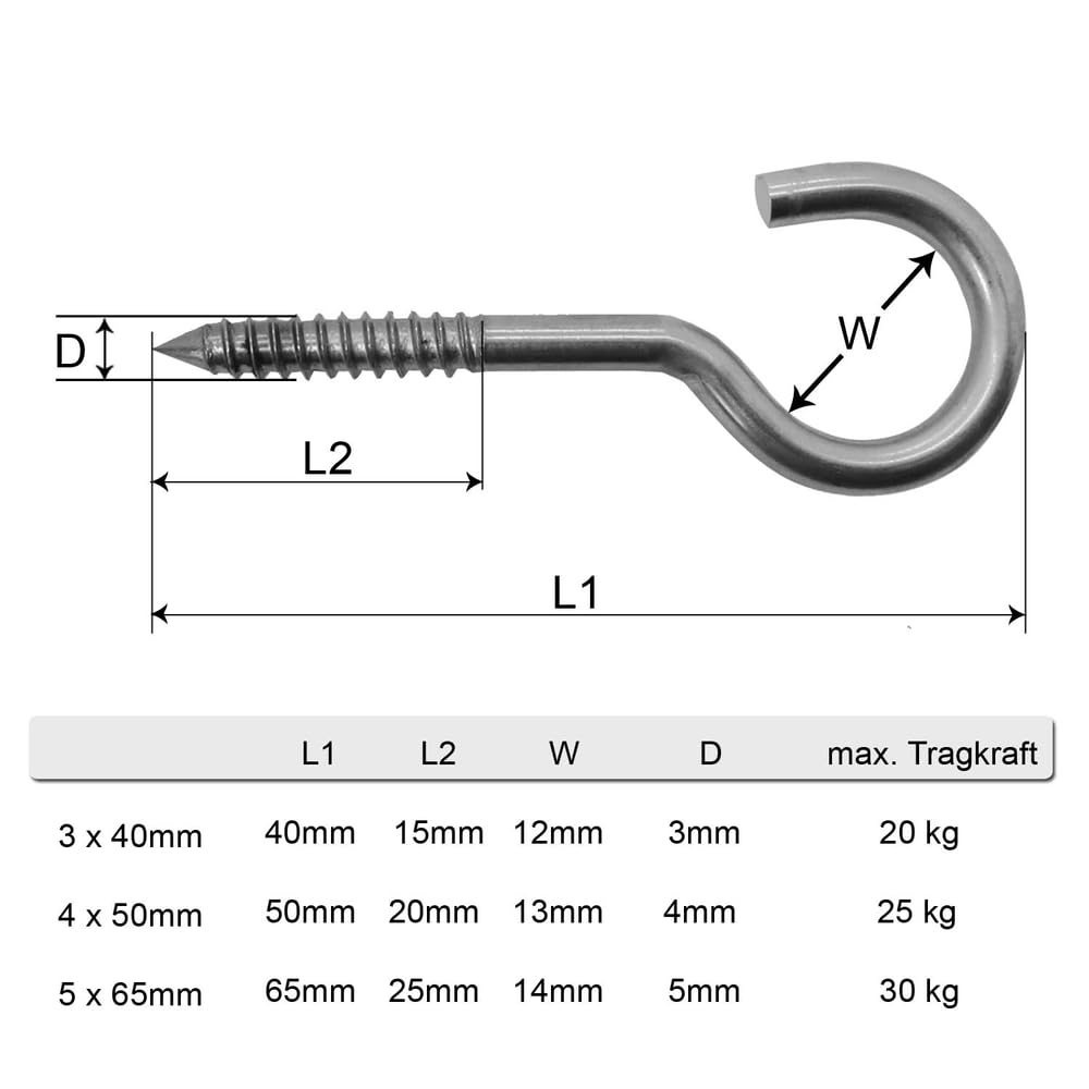 tailles sélectionnables: 4 x 63 mm | 5 x 111 mm | 6 x 100 mm | 8 x 100 mm Irondo® Crochets à Vis Vis à oeil Acier Inox V2A Crochet à vis | Boulons à crochet | Anneau à visser | filetage bois, Taille:Schraubhaken - 4 x 50mm | 1 Stk. : : BricolageÀ propos de cet article Acier inoxydable V2A - Crochets à visser - Vis à crochet Montage facile par simple vis Grâce au filetage en bois, les vis à crochet peuvent être facilement vissées dans des... Ctyjia 20 Pièces Crochets à Vis, Angle Droit, M2,4 x 20 mm Crochet en L, Crochet Mural Pour Suspension Crochet en L en acier inoxydable Gond A Visser Irondo® Crochets à En L Vis V2A En Acier Inoxydable Vis Crochet Grâce au filetage en bois, les boulons à crochet peuvent être vissés dans des poutres en bois ou des bardages sans aucun problème. Il est également possible de l'ancrer dans la maçonnerie avec une cheville Il est également possible de l'ancrer dans la maçonnerie avec une cheville. Matériau: acier inoxydable V2A - forte résilience | Peut être utilisé à l'intérieur et à l'extérieurtailles sélectionnables: 4 x 63 mm | 5 x 111 mm | 6 x 100 mm | 8 x 100 mmVeuillez sélectionner la taille et la quantité souhaitées dans la sélection.
