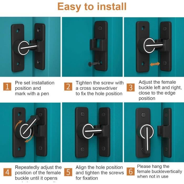 Si vous ne voulez pas endommager les murs ou les portes et fenêtres, vous pouvez choisir de la colle pour les coller. Il n'est pas nécessaire de percer des trous pour l'installation, ce qui évite d'endommager les murs, les portes et les fenêtres. Quincaillerie De Portes Et Loquets TANCUDER Verrou Porte De Grange Coulissante, Verrou Serrure De Fermeture Porte Loquet Porte Coulissante Sans Percage Loquet De Serrure De Porte à 90 Degrés/180 Degrés Pour Armoire, Fenêtre, Clôtures Fermeture Porte Coulissante Matériaux de haute qualité : Nous choisissons des matériaux de haute qualité pour fabriquer des verrous de porte de grange, qui ont une bonne durabilité et stabilité. Application multifonctionnelle : Nos loquets de serrure de porte à 90 degrés conviennent à tous les types de portes, qu'il s'agisse d'une chambre, d'un balcon, d'un garage, d'une fenêtre, d'une grange, d'une porte coulissante, d'une cuisine, d'une salle de bain, d'une armoire ou d'un tiroir, ils fonctionnent même comme une protection de sécurité fiable pour les animaux de compagnie. Verrou de porte de grange, verrous et loquet de Une conception et un traitement soignés garantissent la qualité et la durée de vie du produit, vous permettant de l'utiliser en toute confiance pendant longtemps. Double utilisation à 90/180 degrés : le matériel de verrouillage de porte est disponible pour les portes gauchers et droitiers, ainsi que pour les portes battantes ou coulissantes à 90 ou 180 degrés Peut répondre à vos divers besoins et garantir que vos effets personnels sont protégés en toute sécurité ACCESSOIRES COMPLETS : vous recevrez 1 loquet porte coulissante, 4 vis, 1 colle et 1 autocollant auxiliaire anglais. Installez simplement le loquet de porte sur le cadre de porte, marquez la hauteur et l'emplacement du trou de montage, puis installez-le solidement à l'aide des vis que nous fournissons. Son mécanisme de verrouillage à 90/180 degrés fonctionne également sur les portes de fenêtre et même sur les portes de salle de bain, assurant une sécurité... Achetez Loquet de serrure de porte en alliage de Zinc, loquet de sécurité à 180 degrés qui brille dans la nuit pour portes coulissantes de poche, volets de fenêtre de Garage et de grange du marchand CozyHabitat Store en ligne ❤️ Obtenez les meilleurs nouveaux produits de BestDealPlus.com tous les jours. OCCASIONS LARGEMENT APPLICABLES : nos serrure de porte à boucle conviennent à diverses occasions, y compris les chambres à coucher, les balcons, les garages, les fenêtres, les granges, les portes coulissantes, les cuisines, les salles de bains, les armoires, les tiroirs et bien d'autres domaines. Spécification Matériel: alliage de zinc Taille: 8*2., 5 cm Couleur: Noir Poids total : 160g Le forfait comprend 1 verrou serrure de fermeture porte interieure