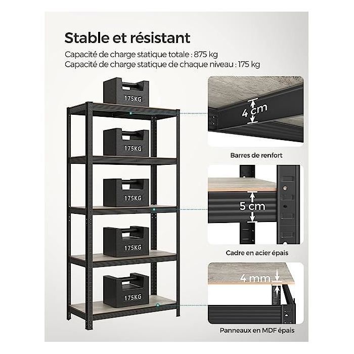 Roues de 7,6 cm pieds de nivellement – Comprend des roulettes pivotantes à roulement fluide (2 verrouillage) pour un positionnement facile dans votre cuisine, garage, entrepôt, ou espace de stockage Description du produit Les étagères de rangement noires DBJ et les étagères métropolitaines en métal robuste offrent une organisation de rangement qui peut supporter jusqu'à 113,4 kg pour chaque étagère en fil métallique avec une capacité totale de 567 kg. De plus, nos étagères ne nécessitent pas d'outils pour le montage. 4 pcs Étagère de rangement | Étagères à 5 niveaux Bleu Acier et bois d'ingénierie CFW79157 étagère 5 Niveaux Cdiscount Étagère De Rangement à 5 Niveaux 170 Cm Plastique Noir 02_0000649 - Maison Etagere De Rangement 5 Niveaux Étagère utilitaire multifonction en acier noir robuste à 5 fils, 76,2 x 35,6 x 152,4 cm, parfaite pour l'organisation du garage, la maison, le bureau, les étagères de rangement, les étagères de rangement de sous-sol et le garde-manger. Displays By Jack Les étagères robustes noires à 5 niveaux sont faciles à assembler sans outils. Displays by Jack Les étagères de rangement autoportantes noires robustes à 5 niveaux peuvent être réglables par incréments de 2,5 cm de large. Suivez toujours les instructions du fabricant pour une installation et une utilisation sûres. Ne surchargez pas les étagères, chaque étagère peut supporter jusqu'à 113,4 kg. Hyper Tough 5 TABLETTES ÉTAGÈRE DE RANGEMENT EN MÉTAL, Couleur Chrome, 158.8kg CAPACITÉ PAR TABLETTE, Étagère à 5 Niveaux, Etagère en Métal Robuste Taille... Chaque étagère dispose de pieds de nivellement pour un positionnement facile dans votre sous-sol, garage, garde-manger de cuisine et étagère de rangement, entrepôt ou zone de stockage.