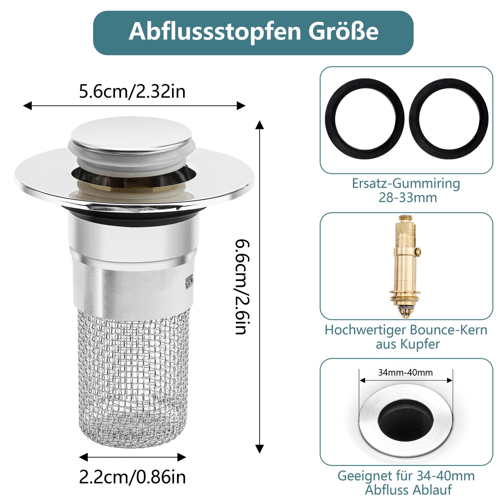 Vous pouvez l'utiliser en toute sécurité pour enlever les poils restants ou les taches Il vous suffit d'insérer le bouchon dans l'évacuation. Taille universelle : ce bouchon de lavabo a une taille universelle et convient aux trous de drainage d'un diamètre intérieur de 34 à 37 mm. L'anneau en caoutchouc et les quatre ailes du bouchon sont solidement fixés au drain. Si le bijou de l'hôte tombe accidentellement dans l'évier, le filtre l'empêche également de tomber dans le drain, ce qui est très pratique Le bouchon de vidange de lavabo peut être facilement fermé et ouvert en 1 seconde. 2 Pièces Bouchon Baignoire, Bouchon Lavabo, Filtre De Vidange Pour Lavabo, Bouchon Lavabo... À propos de cet article : Forte fonctionnalité : ce bouchon de lavabo dispose d'une valve d'eau magnétique intégrée. Facile à utiliser : ce bouchon de vidange de lavabo est facile à utiliser. Forte fonctionnalité : ce bouchon de lavabo dispose d'une valve d'eau magnétique intégrée. Bächlein Bouchon de lavabo universel Pop Up - Filtre de vidange en noir Il peut être utilisé dans de nombreuses situations pour les tuyaux de vidange de cuisine, salles de bains, lavabos, etc Anti Calcaire Bouilloire Bouchon Lavabo, Bonde Baignoire Universelle Pop Up Avec Filtre Anti-Bloqué,Bonde De Lavabo,Bonde Bouchon Lavabo Universel Filtre intégré : ce bouchon de lavabo dispose d'un filtre intégré qui améliore considérablement l'effet anti-obstruction et peut bloquer efficacement les résidus de cuisine et les cheveux. S'il n'y a pas d'eau dans le tuyau d'évacuation, la vanne se ferme automatiquement, ce qui permet d'éviter que les odeurs et les corps étrangers ne débordent du tuyau d'évacuation, ce qui est très pratique Fonction pop-up : avec ce bouchon de lavabo pour lavabo, il suffit d'appuyer sur le bouton au milieu. Matériau. Silicone Acier inoxydable, chrome · Marque. JRJUBB · Couleur. Chrome · Dimensions du produit. 37l x 36H millimètres · Nombre d'articles. 1 S'il n'y a pas d'eau dans le tuyau d'évacuation, la vanne se ferme automatiquement, ce qui permet d'éviter que les odeurs et les corps étrangers ne débordent du tuyau d'évacuation, ce qui est très pratique.