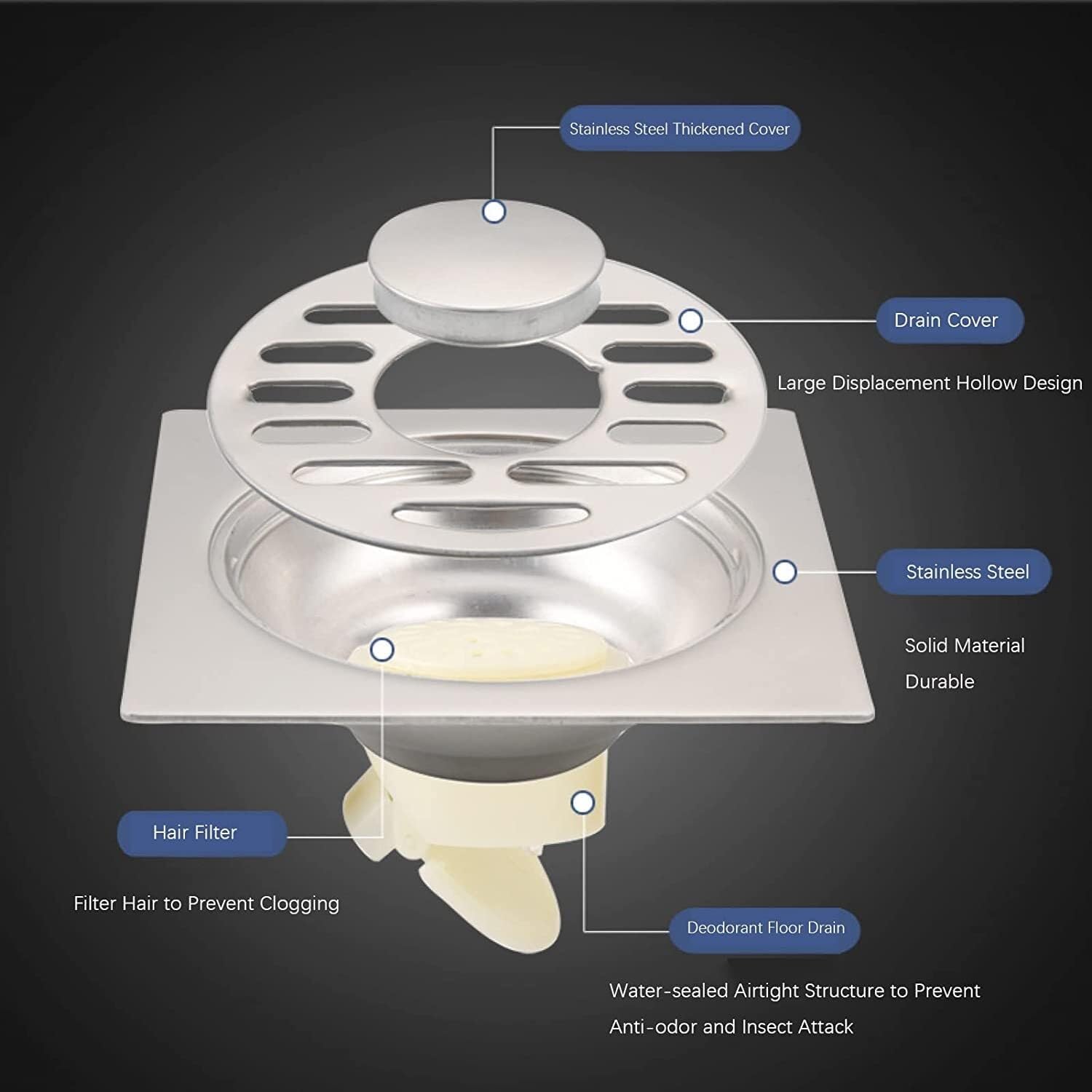 Matériau : acier inoxydable., Couleur : noir., Finition : peinture noire. Merci de votre compréhension., 2., Selon la luminosité et les paramètres d'éclairage des écrans, la couleur réelle de l'article peut être légèrement différente de celle de la photo. Installation facile : aucun outil compliqué n'est requis, il suffit de coller le corps du drain de sol d'origine pour terminer l'installation, même les filles peuvent le faire facilement, apportant ainsi de la commodité à la vie Le produit réel est le seul pouvant être considéré comme standard. Caractéristiques : Ce siphon de sol est fabriqué en acier inoxydable de haute qualité, résistant à la corrosion, aux rayures et pour une utilisation à long terme. Type en option : bonde de sol commune, siphon de sol pour machine à laver. Description : Ce siphon de sol carré est adapté pour la salle de bain, la cuisine pour évacuer les eaux usées, tout en filtrant les cheveux et éviter l'encrassement. Convient pour une utilisation dans la salle de bain, il y a deux types disponibles, l'un est le type commun, l'autre peut être connecté au tuyau de sortie de la machine à laver Convient pour une utilisation dans la salle de bain, il y a deux types disponibles, l'un est le type commun, l'autre peut être connecté au tuyau de sortie de la machine à laver. Drain de sol en acier inoxydable épais, robuste, pour salle de bain... Ce siphon de sol est fabriqué en acier inoxydable de haute qualité, résistant à la corrosion, aux rayures et pour une utilisation à long terme. Bouchon De Vidange De Sol, égouttoir Rond En Acier Inoxydable, Anti-blocage Pour Tuyau D'évacuation Extérieur De Sous-sol (Bouche Plate 110 La conception à double couche empêche les plus gros résidus et évite l'encrassement. Matériau en acier inoxydable résistant, indéformable et pour une utilisation à long terme. Dimensions approximatives : 9,9 x 9,9 x 2,5 cm., Poids : environ 252 ~ 254 g. Les grands trous de drainage garantissent une vitesse de drainage rapide. Bouchon De Vidange D'évier, Noyau De Vidange De Sol En Acier Inoxydablestyle B 65084724