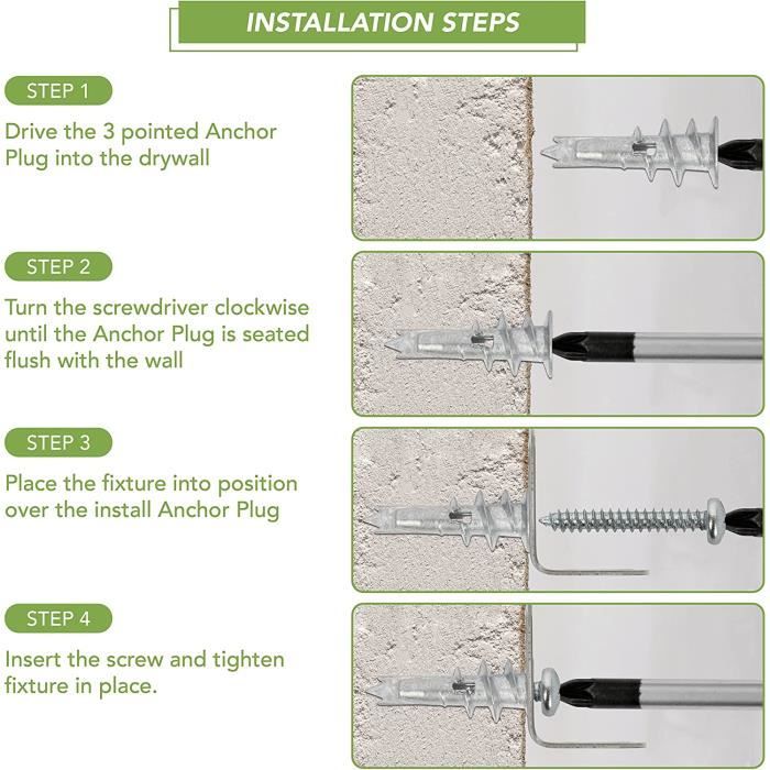 Ancres de mur de forage automatique , Ancre avec vis! Ce dont vous aurez besoin., A. DS7007-006(Two Point) Idéal pour les applications de fixation dans la plupart des panneaux de gypse. declarative( 'acrLink-click-metrics', 'click', { "allowLinkDefault": 405920307109 Étape 3-Préparez votre ancre de mur d'auto-forage Vous n'avez pas besoin d'une perceuse pour les installer, et ils rentrent rapidement et facilement. Étape 4-Percez votre mur sec À l'aide d'un support mural à forage automatique, vous devez simplement forer une fois et une fois seulement, puis vous avez terminé. T.K.Excellent Cheville placo,Cheville placo charge lourde, incluant 50 Stück Chevilles pour Plaque de Plâtre,50 Vis à Tête Cruciforme : : BricolageTout le monde aime les ancres de cloisons sèches auto-foreuses. Vous n'avez pas besoin d'une perceuse pour les installer, et ils rentrent rapidement et facilement. L'un des plus grands avantages de l'utilisation d'une ancre de mur d... Insérez la vis avec le tournevis. Nous fournissons tout ce dont vous avez besoin. Appuyez sur les cloisons sèches tout en tournant l'ancre dans le sens des aiguilles d'une montre jusqu'à ce qu'elle soit assise au ras du mur., C. Vous pouvez choisir le type que vous aimez à la bricolage! execute(function(A) { if (dpAcrHasRegisteredArcLinkClickAction ! Kit comprend : nylon6 13 x 41 mm ancrages, 4,5 x 30 vis aggloméré à tête panoramique, et et une boîte. Hazrcvr Cheville en Plastique 100 Pièces Cheville mur Creux Idéal pour une installation électrique grâce au matériau non-conductivity en nylon. Capsule Dolce Gusto Cogex 69155 Cheville Nylon Autoforeuse à Visser Plaque De Plâtre Vis Vis Placo DS7007-004(Three Point) Construit en plastique durable (Nylon6 fibre de verre), pas de rouille, résistance à la corrosion, anti-vieil, bonne nationalité. Un trou pré-percé de 6 mm peut être nécessaire pour densifier plâtre. Étape 2-Pré-percer vos trous (un trou pré-percé de 6mm peut être nécessaire pour les plaques de plâtre plus denses., ) DS7007-003(One Point) Les ancrages de vitesse en nylon sont parfaits pour monter une grande variété d'objets dans les cloisons sèches et autres surfaces. Kit comprend : nylon6 13 x 41 mm ancrages, 4,5 x 30 vis aggloméré à tête panoramique, et et une boîte. Un trou pré-percé de 6 mm peut être nécessaire pour densifier plâtre