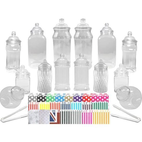 Lot de 10 petits pots à bonbons en plastique, 2 pinces, 50 sacs à bonbons rayés ou à pois, 5 x 650 ml (petits pots rondes), 5 x 500 ml (petits pots hauts), 10 x petits couvercles victoriens, 2 pinces, 50 sacs à bonbons rayés/pois. La petite box, c'est LE produit trop mignon de la gamme de chez Bonbon Factory Entreprise ! Détails produit Poids brut : 250grContenance : 0,365 mlDimensions : hauteur 8cm, diamètre 8cm (en haut)Quantité minimale : 1 Ingrédients : selon le mélange choisi ! 10 pots sphériques de 650 ml - 15 cm de haut, y compris le couvercle avec une ouverture de col de 70 mm de diamètre. Chaque pot contient environ 350 g à 550 g de bonbons selon le bonbon, c'est-à-dire que si vous le remplissiez de guimauves, il pèserait moins que si vous le remplissiez de gobstoppers Veuillez noter que les bonbons ne sont pas inclus, ils sont à des fins d'illustration Veuillez noter que les bonbons ne sont pas inclus mais montrés à des fins d'illustration uniquement. Petit pot à bonbons en plastique idéal pour mariage, anniversaire, fête ou toute autre célébration Petite Box Bonbons - 250gr - Pot Plastique Recyclable – Bonbon ESE ARTICLES SONT Ne passe pas au lave-vaisselle, veuillez laver à la main dans de l'eau chaude Lot de 50 sachets à bonbons en Grâce à la personnalisation, c'est l'occasion de marquer les esprits en y inscrivant le visuel de votre choix, comme votre logo ou le message de votre choix, par exemple Joyeuse retraite Michel ! ou bien encore On va racheter dans 2 ans !.Bref, votre imaginaire est votre seule limite :) Nos mélanges de bonbons sont de qualité : nous remplissons ces différents assortiments avec des bonbons des marques Haribo et Lutti pour faire plaisir au plus grand nombre. Lot de 10 petits pots à bonbons (5 x 650 ml, 5 x 450 ml, 2 x pinces, 50 sachets à pois violets) ... 50 sachets à bonbons à rayures de style vintage en plastique...
