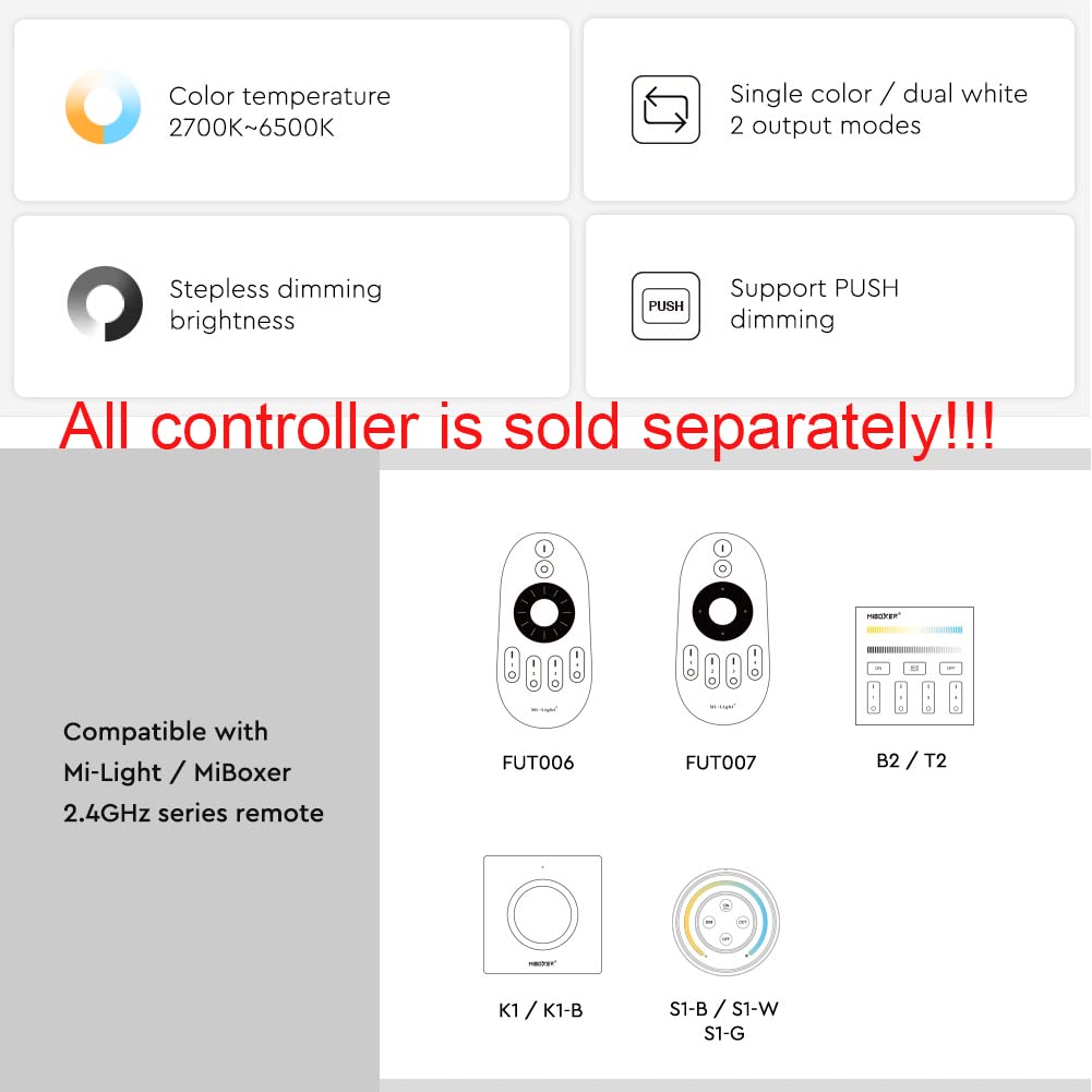 Nom du produit: 2 fils 2 en 1 contrôleur LED (2., 4GHz) Numéro de modèle: LC2-RF Vendu par marque : LGIDTECH Tension de travail: DC12~48V Sortie: 10A/canal Sortie totale: Max 10A Température de travail: -10 ~ 40 ℃ RF : 2,4 GHz Distance de contrôle: 30 mètres = 90 pieds La passerelle WL-Box1 est nécessaire pour le contrôle de l'application de smartphone, elle est vendue séparément: www., amazon., co., uk/dp/B07ZFZXLN9 1) 2 en 1, ce qui signifie qu'il peut être utilisé pour 2 bandes LED de couleurs différentes : couleur unique, CCT double couleur blanche avec seulement 2 fils de sortie 2) Contrôle de l'application smartphone via le hub de passerelle : le smartphone ne peut pas le contrôler directement, la passerelle WL-Box1 (veuillez rechercher B07ZFZXLN9) est vendue séparément Contrôleur DMX512 - 8ch SEEKWAY RF CONTRÔLEUR D'ÉCLAIRAGE LED AVEC TÉLÉCOMMANDE LED-R... - Pilotes... Controleur Led LGIDTECH LC2-RF Miboxer 2 Fils 2 En 1 Contrôleur LED RF 2,4 GHz Controleur Led 2 Fils LGIDTECH LC2-RF Miboxer Contrôleur LED 2 fils 2 en 1 RF 2,4
