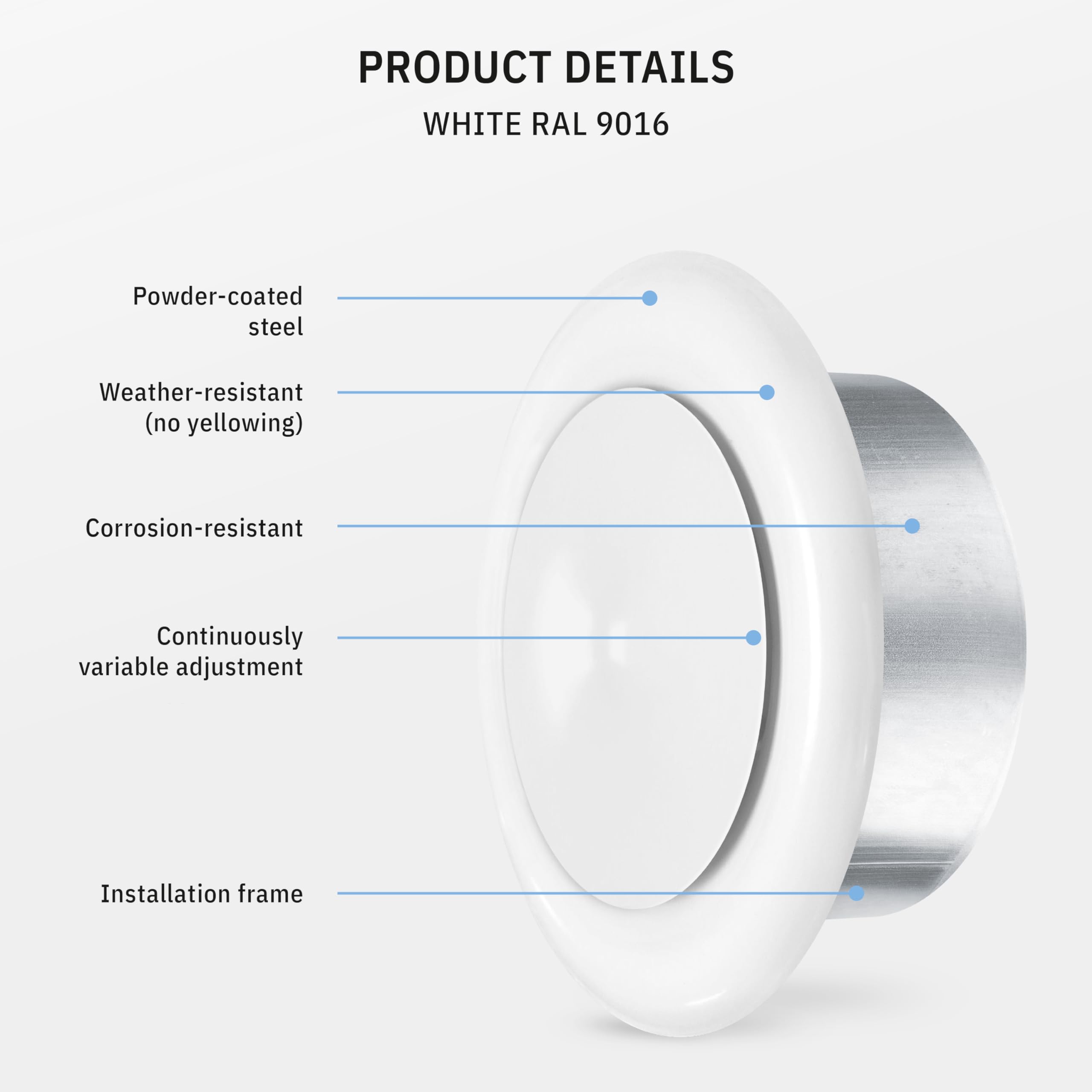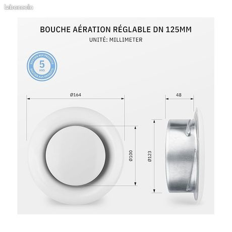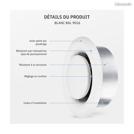 Distribution efficace de l'air Ventilation commerciale et résidentielle La polyvalence et la capacité des vannes à clapet à réguler la distribution de l'air en font un élément précieux des systèmes CVC dans divers secteurs et types de bâtiments. Tvqa Grille Aeration Reglable 100Mm Grille Sortie Hotte Avec Cadre De... Elles sont utilisées dans les habitations privées, les commerces, les hôtels et les laboratoires. calimaero® TVSA Grille d'aération ronde 150 mm avec diffuseur Résistant à la corrosion Le cadre d'installation peut être fixé à l'aide de vis. Dans les systèmes centraux de ventilation commerciale et résidentielle, le débit d'air dans les différentes pièces peut être réglé individuellement. MATÉRIAU La grille aeration blanche est fabriquée en tôle d'acier de haute qualité avec revêtement par poudre. Elle est très robuste, résistante aux intempéries et à la corrosion (pas de jaunissement) et recyclable. Le revêtement en poudre forme une barrière protectrice qui empêche l'humidité et les substances agressives de pénétrer. FONCTION Les ventilation salle de bain... Réglage du débit d'air Le revêtement en poudre forme une barrière protectrice qui empêche la pénétration de l'humidité et des substances agressives. Le revêtement en poudre forme une barrière protectrice qui empêche l'humidité et les substances agressives de pénétrer. FONCTION Les ventilation salle de bain soupapes à disque permettent de contrôler le flux d'air avec précision et de l'adapter individuellement aux différentes pièces. Bouche Vmc 80 TVSA Grille Aeration Reglable 150mm, Grille De Ventilation Vmc Hygroréglable