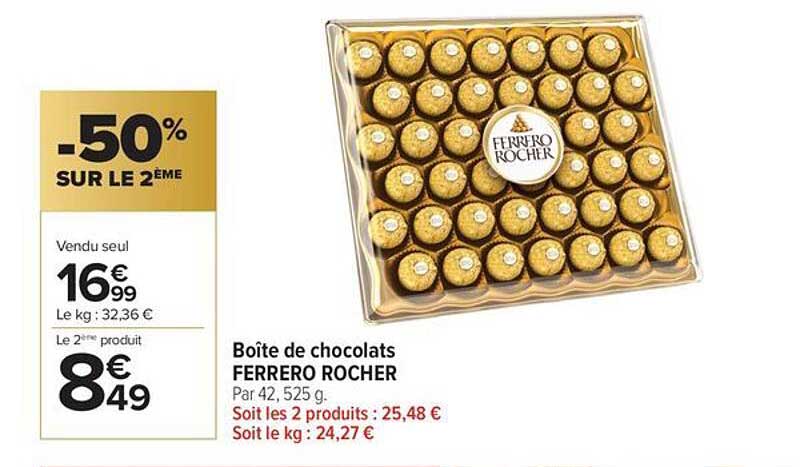 Elles ne sont pas forcément exhaustives et ne sauraient se substituer aux informations figurant sur l'emballage du produit qui font seules foi, et auxquelles vous êtes invités à vous reporter, notamment en cas d'intolérance alimentaire., Le sachet de 126g Après un lancement remarqué l’an dernier, Ferrero Rocher continue d’étoffer son offre av Promo Petits Plaisirs Ferrero Rocher chez Carrefour Express Les indications ci-dessus sont données à titre d'information. Promo Petits Plaisirs Au Chocolat Au Lait Ferrero Rocher chez Cora... Ferrero Rondnoir Ferrero Rocher Lance Les Petits Plaisirs, Des Petites Gourmandises à Rocher Suchard Description du produit Chocolat au lait fourré noisette et cacao avec éclats de noisettes (2%) et éclats croustillants (1,2%). Allergènes : LAIT, NOISETTES, SOJA, GLUTEN Mode d'emploi A conserver au sec et à l'abri de la chaleur Clause de non-garantie Photographie non contractuelle.