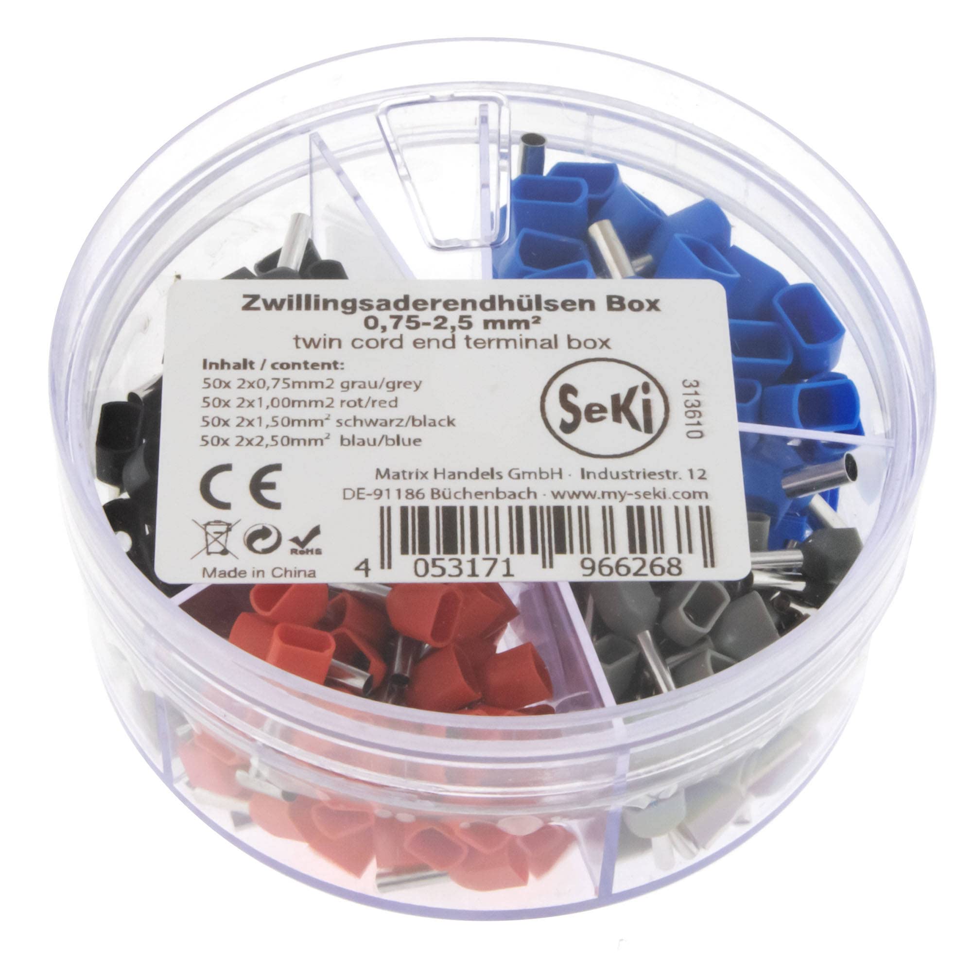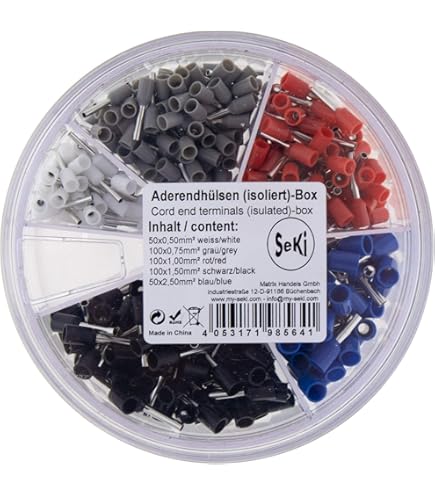 Embouts de fil jumelé 4,0-16,0 mm² - Contenu : 20 x 2 x 4,0 mm², gris. Embouts de câble 0,34-50 mm² isolés Gaines d'extrêmité de cables 10-1000 unité sélection: (10 pièces, 0.34 mm² jaune Embouts de câbles isolées (avec collerette isolante, simple), disponibles en 47 variantes. Un embout de câble est utilisé pour obtenir un contact électrique optimal entre les fils de cuivre dans l’âme du câble et la borne de fixation. Tous nos embouts de câbles sont conformes à la norme DIN 46228/1 SeKi 313613 Lot De 350 Embouts De Câble 4 à 16 Mm² (150 X 4, 75 X 6, 75 X 10, 50 X 16 Mm² ✅ QUALITÉ SUPÉRIEURE : les manchons sont fabriqués selon la norme DIN, ce qui assure une connexion fiable et sûre et répond aux normes de qualité européennes. Embouts de câble jumelés isolés selon la norme DIN 46228/4 en cuivre électrolytique – Galvanisé pour une protection contre la corrosion – Caractéristiques techniques : type : embout de câble jumelé pour section transversale : 10 mm² Longueur totale : 26, 6 mm Longueur douille : 14 mm Diamètre col en plastique : 12, 6 mm Diamètre manchon : 6 mm Diamètre douille 5 x 2 x 16,0 mm², bleu. ✅ Les embouts de câble doubles sont triés comme suit : 20 x 2 x 4,0 mm² gris, 10 x 2 x 6,0 mm² jaune, 10 x 2 x 10,0 mm² rouge, 5 x 2 x 16,0 mm² bleu ✅ SeKi Assortiment de 100 embouts de fils jumelés de 4,0 à 16,0 mm² dans une boîte de saupoudreuse pratique, empilables et refermables SeKi Lot de 45 embouts de câble jumelés isolés 4,0-16,0 mm² (20 x 2 x 4,0 mm² gris, 10 x 2 x 6,0 mm² jaune, 10 x 2 x 10,0 mm² rouge, 5 x 2 x
