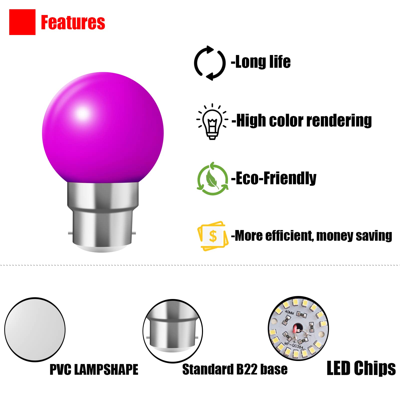 Informations: Dimensions: 45mm x 68mmCouleur: Rouge, Jaune, Bleu, Vert, OrangeForme de l'objet: GlobeMatériau: PlastiqueIntensité: AC 220 - 240 VoltsPiles incluses: NonBatterie/ Pile requises: NonType d'ampoule: LEDBase de l'ampoule: B22Puissance: 3 WattsÉquivalence lampes à incandescence: 30 WattsEfficacité lumineuse: 300 LumenCaractéristiques spéciales: Efficacité énergétique, Non VariableNombre d'ampoules: 10 Consommation de 3W pour une lumière restituée équivalente à une ampoule à filament de 10 à 30W. Puissance Lumineuse: 300 lumens pour seulement 3W nouvelle version SMD LED 2023 Culot renforcé incassable. ampoule guirlande couleur b22 ; Ampoule led couleur b22 3w équivalente 30w ... · 18,91 € ; Ampoule led couleur b22 3w équivalente 30w ... · 14,44 € ; Ampoule led... Puissance Lumineuse: 300 lumens pour seulement 3W nouvelle version SMD LED 2023 Culot renforcé incassable. Ce lot contient 10 ampoules LED 3W culot B22 baillonette (2 de chaque couleur). Lot de 10 Ampoules LED B22 3W, Équivalent 30W, Ampoule...Appliquer l'éclairage domestique, les lampadaires de nuit... Ampoule A Baïonnette Lot De 10 Ampoules LED Colorées B22 à Baïonnette 1 W G45 Couleurs Ampoule Balle De Golf Couleurs Mélangées Rouge Bleu Vert Jaune Orange Atmosphère Décoration Pour Extérieur Intérieur String Mariage Ampoule Couleur Ampoules Guirlande pas cher - Meilleures ofes neuf et occasion