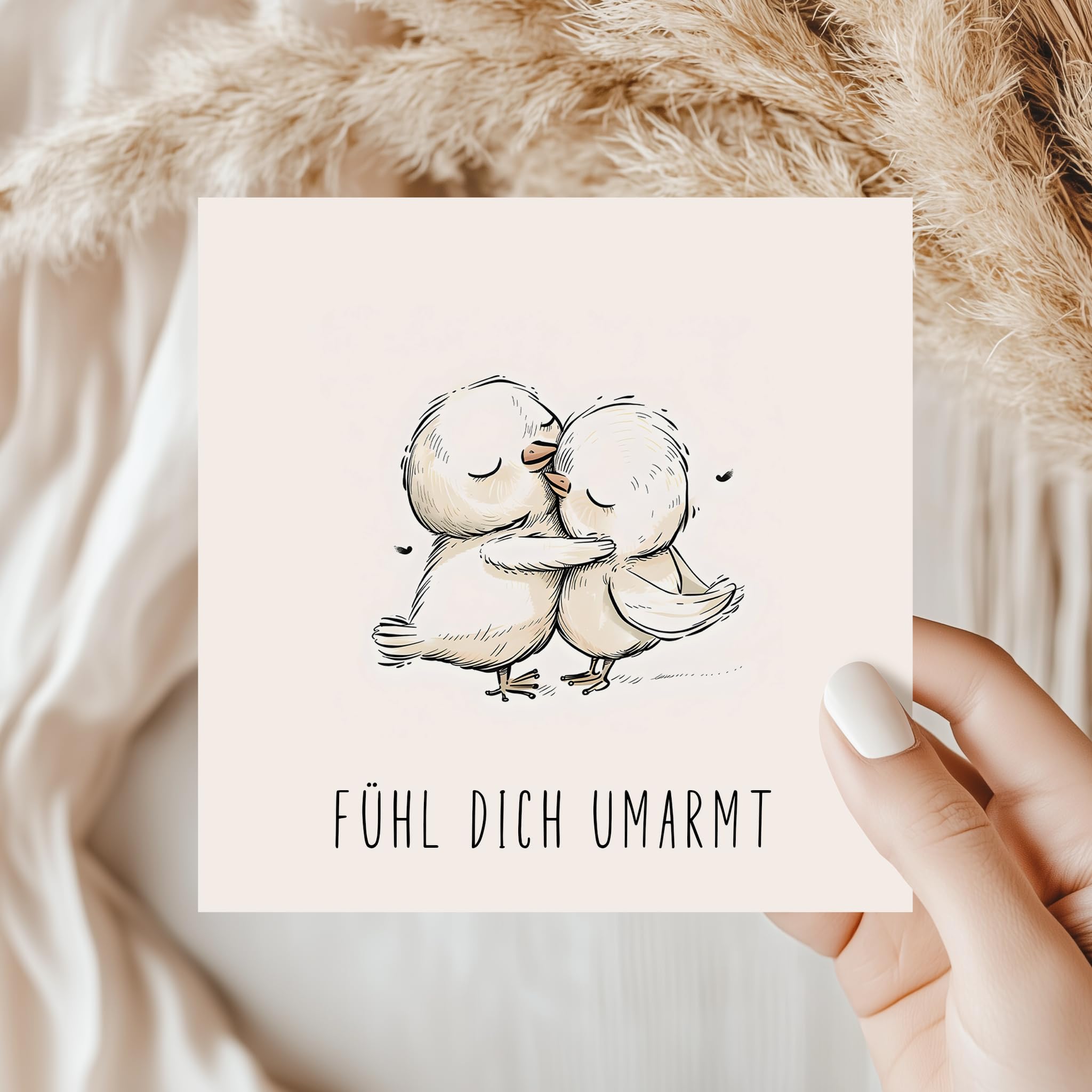 Ce charmant motif symbolise la chaleur et la proximité, idéal pour transmettre des messages émotionnels et de soutien et donner au destinataire le sentiment d'être étreint, même lorsque vous ne pouvez pas être physiquement présent. Les couleurs vives et la représentation claire du motif adorable garantissent que la carte est à la fois visuellement attrayante et touchante émotionnellement. Ce charmant motif symbolise la chaleur et la proximité, idéal pour transmettre des messages émotionnels et de soutien et donner au destinataire le sentiment d... L'enveloppe protège la carte en toute sécurité et complète son design avec une touche rustique et naturelle, ce qui complète l'ensemble avec style et la rend idéale pour offrir ou envoyer la carte avec style. Cette enveloppe complète l'image globale et rend la carte prête à être expédiée, qu'elle soit présentée en personne ou envoyée par la poste. Impression de haute qualité sur papier premium : imprimée sur du papier premium de 300 g/m², cette carte se distingue par son excellente qualité d'image et sa durabilité. Cette carte au format 125 mm x 125 mm présente deux adorables oiseaux qui se retrouvent ensemble dans un câlin touchant, sous la phrase correspondante « Sentez-vous étreinte ». Elle peut être offerte à des collègues, des amis ou des membres de la famille qui relèvent un nouveau défi, déménagent ou commencent un voyage. « Sentez-vous étreinte » est plus qu'une simple phrase, c'est un message qui réconforte et renforce l'attachement même lorsque les mots sont difficiles. Découvrez nos exemples de textes à glisser dans votre carte bon rétablissement : des formules courtes, sincères et adaptées à chaque situation, pour apporter un... La carte convient parfaitement comme ajout à des cadeaux d'adieu ou comme geste autonome pour ajouter une touche personnelle et chaleureuse à vos adieux. Cartes Bon Retablissement : Envoyer Une Carte Bon Retablissement Dès 0,99 Que ce soit pour dire au revoir à un bon ami, ou pour réconforter les membres de la famille qui s'en vont, cette carte transmet vos sentiments d'une manière à la fois touchée et mémorable. L'impression de qualité supérieure sur du papier de qualité supérieure de 300 g/m² garantit que les couleurs délicates des oiseaux et les émotions qu'ils transmettent sont clairement et vivantes. Le papier solide garantit que la carte n'est pas seulement un plaisir au toucher, mais sert également de souvenir durable. Elle est idéale pour le dernier jour de travail, comme ajout affectueux à un cadeau d'adieu ou tout simplement comme geste spécial pour donner un cadre personnel et chaleureux à vos adieux. Oiseau coloré pour un rétablissement serein - envoi rapide