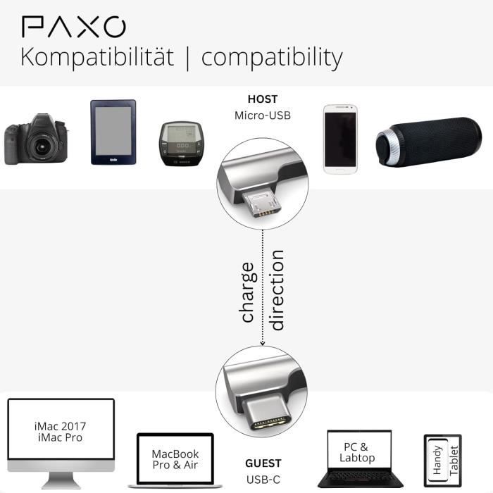 Parfait pour connecter des appareils USB - C (MacBook Pro, MacBook Air, PC et divers smartphones, etc. PAXO | Câble OTG Câble OTG élégant | Connecteurs dorés connecteurs dorés pour une apparence élégante et à la mode Casques & haut-parleurs Bluetooth Aazon Basics Câble USB-C vers icro B 2.0, 0,9 - Noir Pour... À quoi dois-je faire attention avec OTG ? Les appareils (hôtes) et les périphériques doivent être compatibles avec la norme USB OTG. Synchronisation/transfert de données rapides jusqu'à 480mbit/s Ne te contente plus de brancher tes appareils en fonction de l'endroit où tu te trouves Insérer flexible | Rallonge de 2 m une flexibilité totale Transfert de données super rapide et charge rapide grâce à une très grande section de câble (AWG24 standard). avec port micro USB. conclusion ) à des... OTG supporte un courant de charge jusqu'à 500 mA Lecteurs MP3 & musique Claviers / pianos électriques , disques durs externes , selfie sticks / Gimbal double gaine tressée en nylon et fibres polyamide durcies pour une plus grande durabilité, Chargement fiable | USB 2., 0 La norme USB 2., 0 supporte des taux de transfert de données allant jusqu'à 480 Mbit/s. ) à un périphérique compatible USB 2., 0 OTG avec port micro-USB Cable Usb C Micro Usb PAXO Câble USB C Vers Micro USB De 0,3m, Charge Les Appareils Cable Usb C Vers Micro Usb Câble spécial avec USB-C comme connexion hôte/principale et Micro-USB comme connexion secondaire pour le transfert de données bidirectionnel. Exemples d'applications : Côté USB-C pour la télécommande DJI, le gimbal, l'ordinateur de vélo ou les anciens smartphones Android ; côté Micro-USB pour les smartphones, les disques durs ou les claviers. ⚡ Charge des appareils MICRO USB sur des sources d'alimentation spéciales USB C, comme par exemple un ordinateur, une prise USB C pour voiture, un bloc d'alimentation USB C, une banque de puissance, des smartphones, etc. Blue Yeti Micro PAXO Câble Mini USB En Nylon Noir De 0,3m, USB Vers Mini USB Câble Ti 83 Premium Ce Edition Python Tablettes, Kindle, manettes PS4, manettes Xbox One, divers gamepads 💻 Transfert de données bidirectionnel possible. Ce câble permet, comme nous l'avons déjà mentionné, d'établir une connexion directe entre votre téléphone portable ou votre PC et certains appareils. Longue durée de vie grâce à une gaine en nylon fiable +++ GARANTIE DE SATISFACTION +++ Questions sur le produit ? Des problèmes ? Nous vous aidons rapidement et simplement !