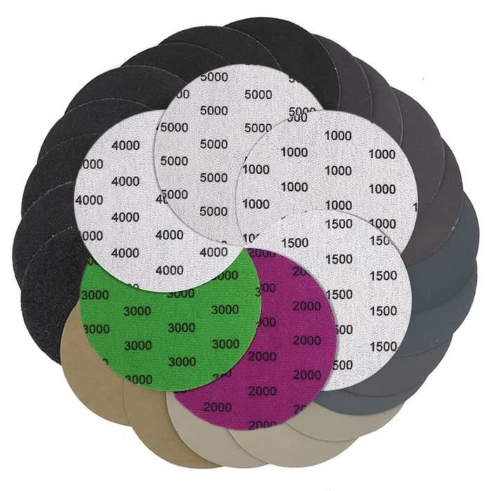 Papier de Verre Sec à l'Eau 75 mm, 30 Pièces Papier à Poncer Rond, 1000/1500/2000/3000/4000/5000 Disques de Ponçage, pour Métal, Bois, Meulage, Polissage Miroir Généralement utilisées pour polir le métal, le bois, le plastique, l'aluminium, la pierre artificielle, les meubles en bois, le traitement des moules, le polissage des voitures , etc. Papier de Verre 120 à 2000 Grain Papier Abrasif Eau/Sec 9 x 3,6 pouces 10 Grains Polyvalents pour Tous Vos Besoins: Ce pack de 50 disques abrasifs de 75 mm comprend 5 disques pour chaque grain (600, 800, 1000, 1200, 1500, 2000, 2500, 3000, 4000, 5000). Idéal pour le ponçage grossier, le lissage fin et le polissage miroir, ces disques répondent à tous vos projets, du travail du bois à la restauration automobile. Matériau Haute Performance et Durable... 【Design Velcro】Le dos du papier de verre de 75 mm a un design velcro qui peut être collé sur une ponceuse orbitale. Papier De Verre Bois Papier De Verre Sec à L'Eau 75 Mm, 30 Pièces Papier à Poncer Papier Poncer 【Matériau de qualité supérieure】 Le papier abrasif humide et sec est composé de carbure de silicium noir et de papier latex, résistant à l'usure, antistatique, très flexible et difficile à casser lors du polissage, un bon choix pour le meulage et le polissage. Peut également prolonger la durée de vie du patin de ponçage. 【Facile à utiliser】 Cette meule sèche humide peut être utilisée pour le polissage à la main. Ce qui permet d'économiser efficacement votre temps de travail.[Papier Poncage]Le papier de verre de 75 mm est convient à la plupart des outils rotatifs, tels que meuleuses à matrice, meuleuses pneumatiques, perceuses électriques, etc. Le papier de verre peut être utilisé pour poncer et polir des matériaux tels que le métal, le bois...