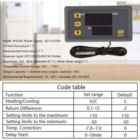 AUN Thermostat à affichage numérique - Thermostat de sortie de relais de régulateur de Spécifications :Matériel : élément électroniqueTension : cc 12 V/24 V/110-220 V(facultatif)Puissance : 120/240/1 500 W (en option)Poids : environ 48 g/1,7 ozListe des packages :1 x capteur de contrôleur d'alarme de température de thermostat numériqueRappel :Le réglage P3 1 signifie que le thermostat s'arrêtera de fonctionner pendant 1 minute, et appuyez longuement sur SET pour déclencher à nouveau. Appuyez longuement sur SET pour déclencher à nouveau. LARGE APPLICATION : Notre régulateur de température convient à tous les types de machines à fruits de mer, compresseurs CVC, réfrigérateurs, climatiseurs, congélateurs coffres, refroidisseurs d'eau et autres équipements nécessitant une commutation automatique entre la réfrigération et le chauffage. Thermostat Prise Thermostat Régulateur,Régulateur De Température Numérique LED,interrupteur De Commande,capteur Thermostat Hors Gel Vous pouvez définir la limite de température maximale/minimale pour éviter les accidents. FACILITÉ D'UTILISATION : La interrupteur de commande de thermostat à affichage LED active automatiquement le refroidissement ou le chauffage pour maintenir une température constante. ALARME HAUTE TEMPÉRATURE : Ce régulateur de température numérique a une fonction d'alarme de température élevée. DEUX MODES DE FONCTIONNEMENT : La thermostat frigo peut choisir deux modes de fonctionnement de refroidissement ou de chauffage. Une fois que l'utilisateur a réglé la température, le P5 peut être réglé sur ON pour empêcher les autres de la modifier à volonté. Module de thermostat numérique à double affichage - Module de contrôleur de température... Après le réglage, le tube numérique ne s'allumera pas jusqu'à 1 minute après le travail normal.