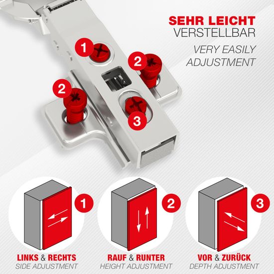 ✅ SOFTCLOSE CONFORTABLE - Grâce à l'amortisseur, ces charnières Softclose ferment la porte en douceur et sans bruit et évitent les claquements bruyants des portes de meubles. ✅ CONTENU DE LA LIVRAISON : 2 paumelles à boîtier, y compris plaque en croix, vis et cache pour boîtier et bras de charnière - Jugez par vous-même ! ✅ ROBUSTE & LONGUE DURÉE - Charnières d'angle robustes en acier pour les portes de meubles présentes, faciles à monter et à régler. Lot de 20 charnières de pot SOTECH T52, charnière d'angle avec FERMETURE DOUCE CONFORTABLE - Grâce à l'amortisseur, ces charnières à fermeture douce ferment la porte en douceur et sans bruit et empêchent les portes des meubles de claquer bruyamment. La durabilité de l'amortisseur a été testée avec succès sur 50., 000 cycles. Charnière à pot SOTECH-SMOOTH T52 butée d'angle 105° amortie installation par clic avec plaque de montage en croix et vis (pack de 2) Ces charnières de meubles ont été testées avec succès pour leur durabilité avec 50 000 cycles. 2 pièces SOTECH Charnières grand angle T52 Butée centrale (semi-présentée) 165° avec Soft-Close y compris plaque de montage - Caractéristiques parfaites du produit, précision d'ajustage et fonctionnalité sont les caractéristiques les plus importantes lorsqu'il s'agit de choisir les charnières et paumelles adaptées de SOTECH ✅ UNIVERSELLE - La charnière à boîtier avec un diamètre de boîtier de 35 mm et une distance de perçage de boîtier de 52 mm (comme le schéma de perçage HETTICH) est une taille standard universelle et s'adapte à la plupart des meubles disponibles dans le commerce. Une chose est sûre - vous bénéficiez toujours de la qualité S&O parfaite et du service S&O optimal. Charniere Porte Cuisine Ferrari Charnière INTEGRA Avec Amortisseur Intégré Ouverture 110° Pour Porte En Applique Charnière Amortisseur ✅ CONTENU DE LA LIVRAISON : 2 paumelles à boisseau, y compris plaque cruciforme, vis et cache pour boisseau et bras de charnière - Jugez par vous-même ! Montage et démontage sans outils de la porte sur la carrosserie (technologie de montage rapide) pour diamètre de perçage de pot : 35 mm Profondeur : environ 12 mm Distance de perçage pour les vis de fixation (T52 comme schéma de perçage Hettich) : 52 mm Décalage 0 mm Plaque de montage en croix en acier à visser Hauteur : 2mm Distance de perçage pour vis de fixation : 32 mm Réglage tridimensionnel des portes de meubles en profondeur, support et hauteur Réglage latéral et en profondeur chacun ± 2mm Réglage en hauteur UTILISABLE UNIVERSELLEMENT - La charnière à cuvette avec un diamètre de cuvette de 35 mm et une distance de perçage de cuvette de 52 mm (comme le schéma de perçage HETTICH) est une taille standard universellement utilisée et s'adapte à la plupart des meubles disponibles dans le commerce. La porte peut être retirée sans problème grâce à un clip sur la paumelle. ASSEMBLAGE ET ENTRETIEN FACILES - La charnière en pot pour portes existantes est facile à assembler avec le matériel de montage inclus et réglable en trois dimensions. Avec son angle d'ouverture de 105°, elle convient parfaitement aux portes d'armoires dans la cuisine, le salon et la salle à manger. UNIVERSELLE - La charnière à boîtier avec un diamètre de boîtier de 35 mm et une distance de perçage de boîtier de 52 mm (comme le schéma de perçage HETTICH) est une taille standard universelle et s...