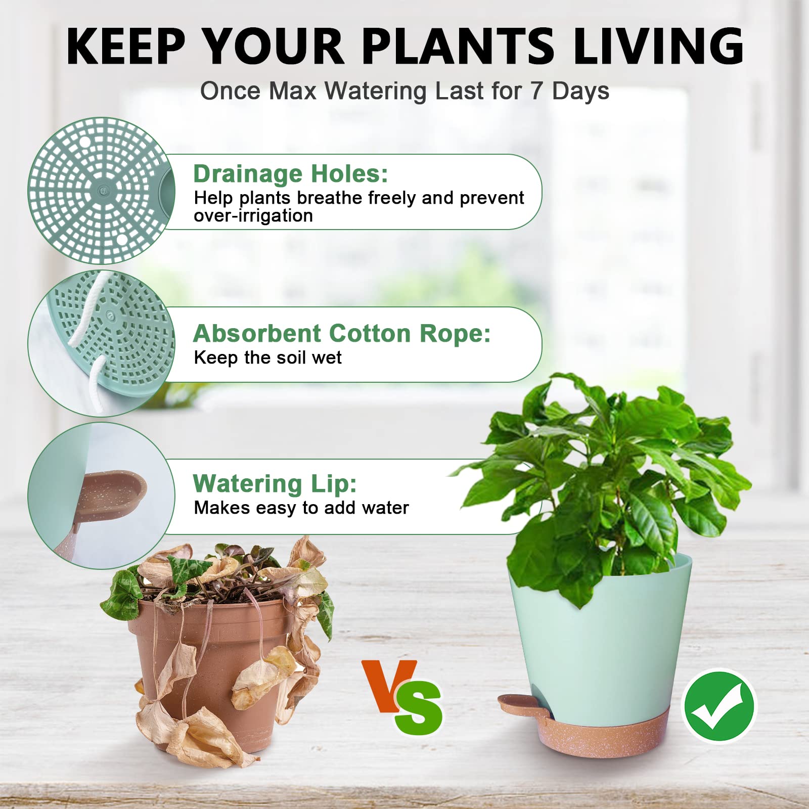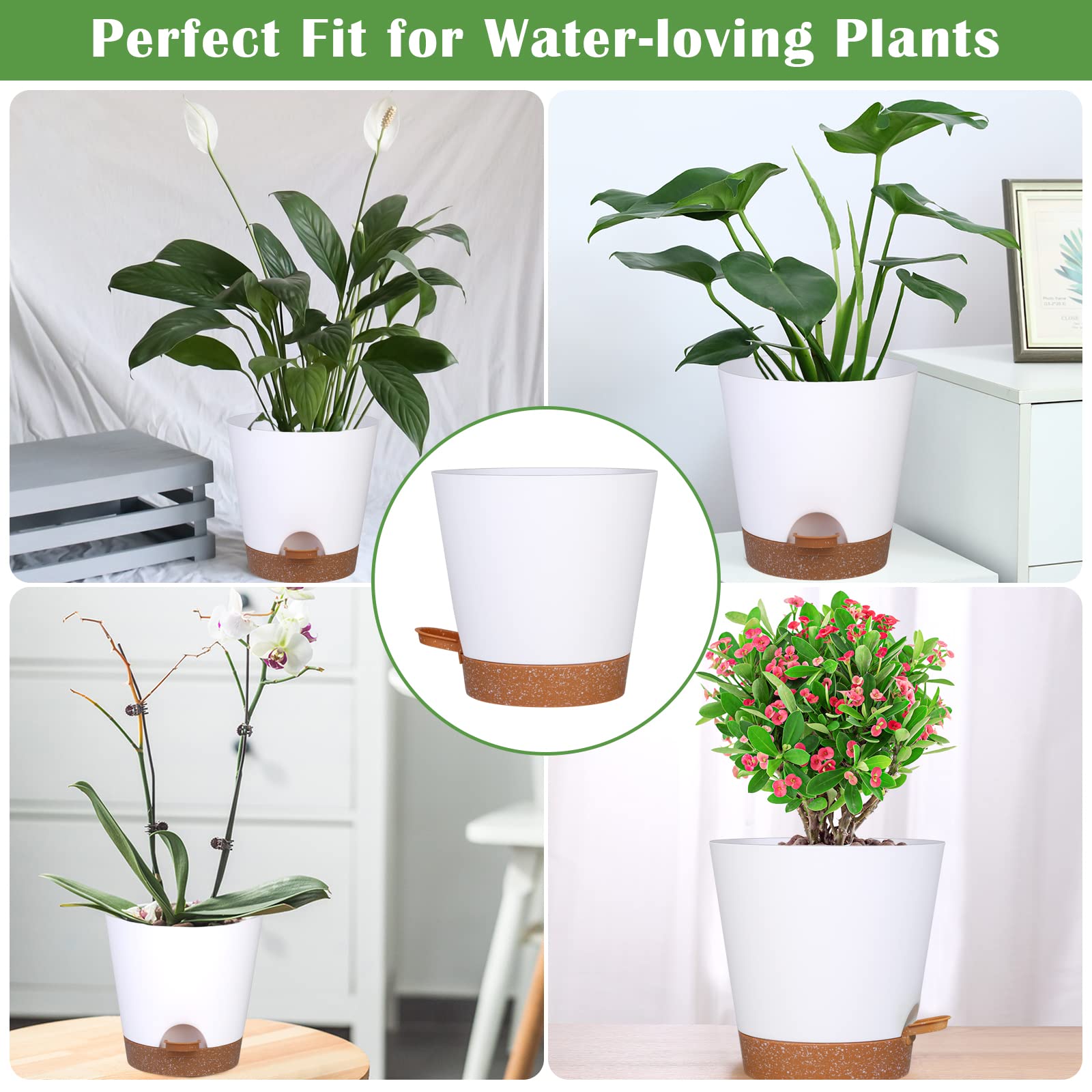 Design créatif de rebord d'arrosage : pot de fleurs Mckanti auto-arrosage conçu avec des lèvres d'arrosage amovibles, l'arrosage des plantes dans ces pots devient plus pratique et efficace. Lot De 5 Pots De Fleurs à Arrosage Automatique En Plastique De 15,2 Cm Avec Corde Absorbante Et Soucoupe, Auto-arrosage Pour Plantes D'intérieur Et D' Extérieur (blanc Arrosage adaptatif : le pot de fleurs Mckanti auto-arrosage est livré avec un plateau amovible de grande capacité, facile à utiliser et une grande capacité de stockage. Caractéristiques du produit : - S'adapte parfaitement à tous les styles de pièce : esthétique moderne minimaliste et finitions mates épurées qui apportent un style minimaliste pour s'adapter à n'importe quel endroit. Ces pots de fleurs sont parfaits pour les plantes d'intérieur de différentes couleurs, apportant une expression visuelle moderne et élégante à tout décor de maison/bureau sans aucun sentiment de violation. Pots de plantes auto-arrosants Ne vous inquiétez plus que si vous ajoutez accidentellement trop d'eau, vos plantes inonderont et l'excès d'eau s'écoulera automatiquement à travers le trou. En conséquence, un arrangement unique de plusieurs trous de drainage a été conçu pour mieux fournir l'infiltration d'eau et d'air, fournissant une croissance saine des racines pour les plantes. Système D'arrosage Automatique]Ce pot avec réserve d'eau intègre un réservoir efficace à la base de chaque pot, capable de stocker une grande quantité... S'adapte parfaitement à tous les types de style de pièce : esthétique moderne minimaliste et finitions mates épurées avec des plantes d'intérieur plantées apportent un style minimaliste. - Réservoir indépendant : isole complètement l'environnement de croissance des plantes de l'environnement de stockage de l'eau. Utopia Home Lot de 5 pots de fleurs en plastique pour plantes grasses - Lot de 5 pots de fleurs auto-arrosage avec 5 cordes absorbantes. Design unique multi-trous de drainage : afin de concevoir le trou de drainage au fond du pot de fleurs, nous avons interrogé de nombreux amateurs de plantation, mené des recherches approfondies sur le marché et constamment amélioré ce pot de fleurs auto-arrosant. Ces pots de fleurs sont parfaits pour les plantes d'intérieur de différentes couleurs, apportant une expression visuelle moderne et élégante à tout décor de maison/bureau sans aucun sentiment de violation. Vous n'avez plus à vous soucier des problèmes mortels comme les canalisations bouchées ou les fuites. Ferme, durable et résistant à la corrosion : les pots d'arrosage automatique sont fabriqués à partir de plastique recyclable durable, les pots en plastique solide protègent les plantes et la terre.