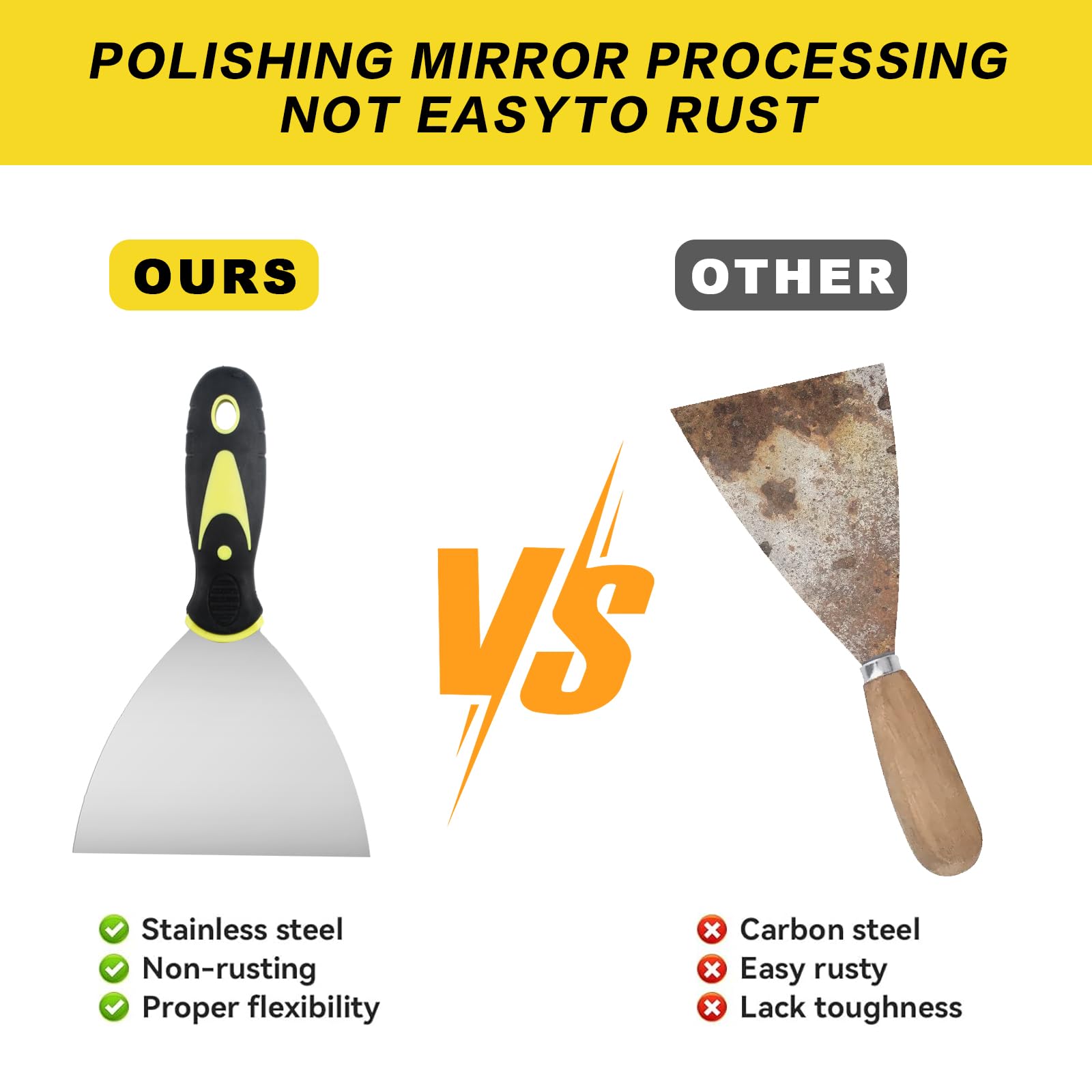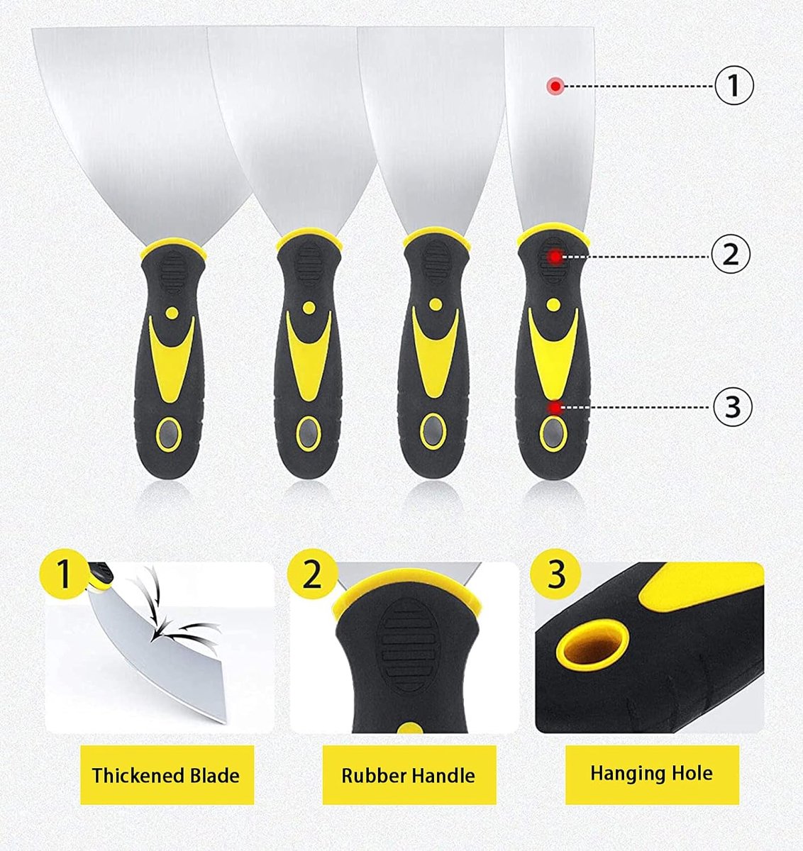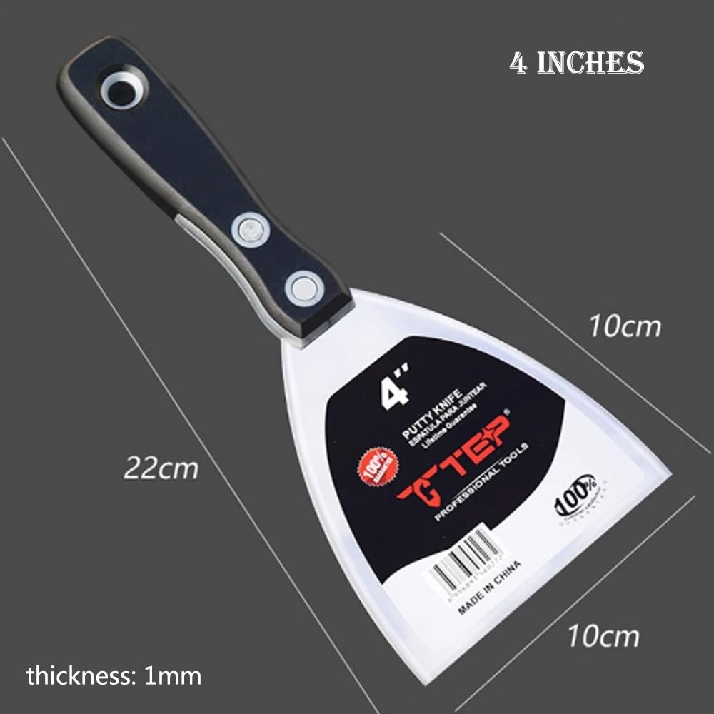 Poignée confortable : ces couteaux à mastic en acier inoxydable sont conçus avec une poignée en plastique confortable et douce. Cet ensemble offre 4 tailles différentes pour différents besoins, assez pour votre usage quotidien. Set De 4 Grattoirs à Mastic En Acier Inoxydable Pour Nettoyer Et Utilisation répandue : le couteau à mastic mural en acier inoxydable permet de remplir les trous, lisser les fissures dans le bois, le plâtre, la maçonnerie et le papier peint pour créer une surface lisse. - Lot de 4 décapants de peinture, contient 5,1 cm, 10,2 cm, 15,2 cm, 20,3 cm. Travailler sur des surfaces inclinées peut être fait rapidement. - La poignée ergonomique du grattoir à papier peint est fabriquée en polypropylène et TPR, poignée confortable et douce, avec guide de doigt. Également pour enlever la peinture de la brique, du bois, de la pierre, des murs intérieurs, etc. - Dimensions : 5,1 cm ; 10,2 cm ; 15,2 cm ; 20,3 cm. Nous vous proposons un choix varié d Veuillez nous contacter si vous rencontrez des problèmes avec nos spatules à racler. Matériau de haute qualité : cet ensemble de grattoir à peinture est fabriqué avec des lames en acier inoxydable de haute qualité et une poignée en plastique... Cet outil de retrait de papier peint n'est pas seulement idéal pour les travaux de tapisserie, il est également polyvalent pour de nombreux autres travaux. - Les trous dans chaque poignée permettent un rangement facile sur n'importe quel clou ou planche à pain. 4 tailles pour différentes utilisations : ce lot de couteaux de remplissage pour murs contient 4 grattoirs à peinture. Cet ensemble offre différentes tailles pour différents besoins. Generic Ensemble De Grattoirs, Brosse Aer Inoxydable Pour Oral - Prix