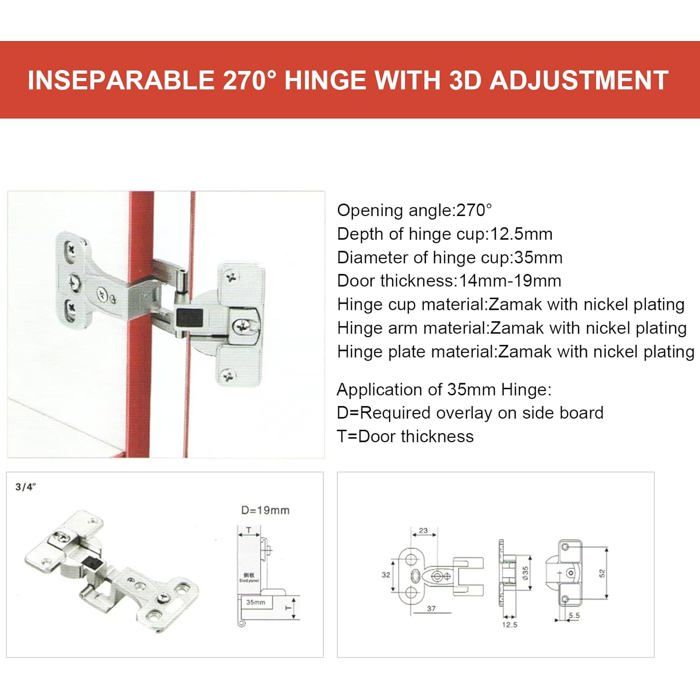 【MATÉRIEL DE ALLIAGE DE ZINC】: La 270 degré charniere est faite de matériau en alliage de zinc, la surface est nickelée, pas facile à oxyder, résistant à la corrosion. Cette charnière pliante de porte de meuble est la solution parfaite pour tous vos besoins de charnière pliante. Avec une installation facile, cette charnière est sûre de faire de tout projet de bricolage un jeu d'enfant 【LARGEMENT UTILISÉ】: Nos charnieres porte cuisine largement utilisées dans toutes sortes de portes d'armoire, telles que les portes d'armoire de cuisine, les portes d'armoire de salle de bains, les armoires de miroir, les armoires de chambre à coucher, les armoires à chaussures de salon, les armoires à couverts, etc. Charniere Invisible 90 Degré Charniere Porte Placard Avec Vis, Charnières à Fermeture Douce Charniere Porte Lourde 【GARANTIE DE SERVICE】: Les accessoires de fixation de charnière peuvent garder votre famille loin du bruit des armoires qui se ferment soudainement. Support Hinge 2 Pièces Charnières de Porte de Placard Support Charnière... Charnières De Pliage De Meubles De Cuisine Les charnières ne sont disponibles que pour les panneaux de porte de 14 à 19 mm / 0,55 à 0,75 Po d'épaisseur. 【PAQUET COMPREND】: La hinge de porte meuble a 1 charnière et 6 vis, conception unique, apparence compacte, capacité de charge de 2 jusqu'à 15kg.