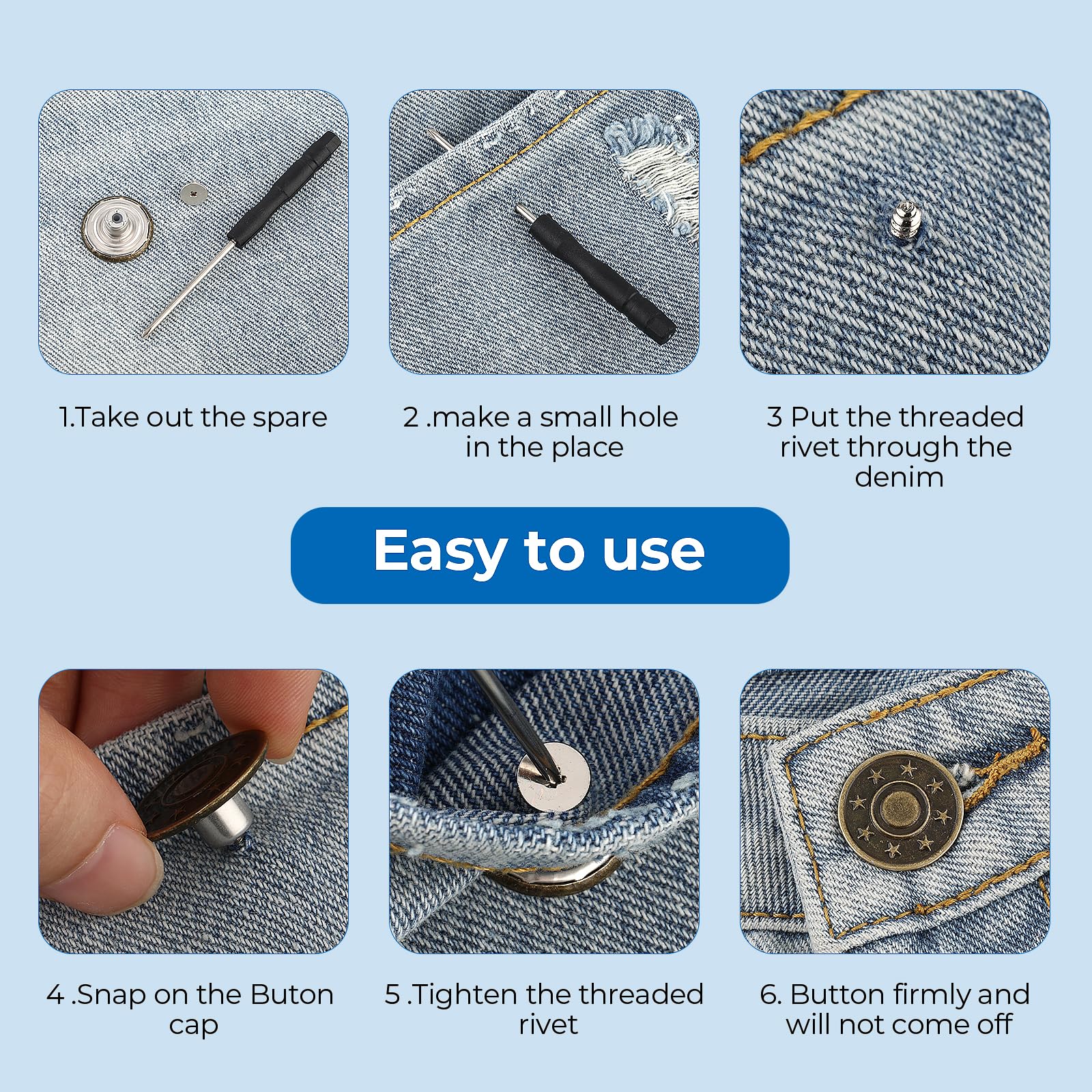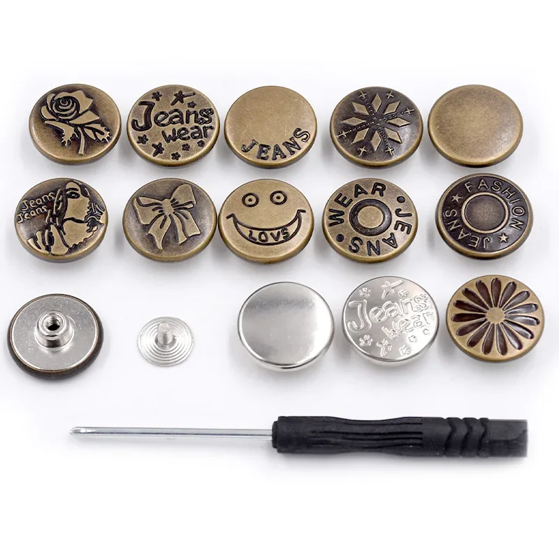 C'est également un excellent remplacement pour un bouton manquant. Nombreuses utilisations : boutons de jeans pour jeans, vestes, bretelles, chemises, sacs, artisanat en cuir et autres tissus solides pour remplacer le bouton de jean. Robuste et durable : les boutons de jeans sont fabriqués en alliage de zinc de haute qualité, durable et résistant à la corrosion. Les rivets de l'édition renforcée ne sont pas faciles à plier et à endommager, pour une utilisation durable et un entretien facile. ★Facile à utiliser : les ensembles de boutons sont faciles à utiliser et efficaces. Tout ce dont vous avez besoin est un marteau pour une installation rapide et facile des boutons. (pas de couture nécessaire Découvrez notre vaste gamme de SHEIN 6 pièces/12 pièces Boutons de jeans de rechange 17 mm sans couture Kit de réparation de boutons en métal Boutons de jeans amovibles sans clou Combo pour la Saint-Valentin, le mariage, l'anniversaire, boutons, couture, fournitures de couture, accessoires de couture, fournitures artisanales... Boutons De Rechange Pour Jeans, 17mm, Sans Couture, Sans Tenir hors de portée des enfants pour éviter toute ingestion accidentelle. 10 Pièces Bouton pour Coudre des Jeans en Métal 17 mm Contenu de l'emballage : 15 capuchons de bouton, 15 rivets filetés, 1 tournevis. Mise à niveau : rivets filetés sans clous, faciles à démonter et réutilisables. Lorsque la taille de votre pantalon est trop serrée ou trop lâche, il peut être installé au bon endroit pour que le pantalon s'adapte mieux à votre taille.