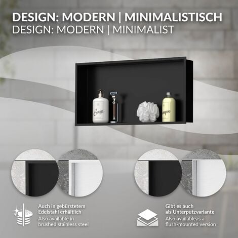 Dimensions intérieures : 50,8 cm de long x 30,5 cm de hauteur x 10 cm de profondeur. Niche de douche noire en acier inoxydable de 50,8 cm peut être installée horizontalement., Montage en saillie. Aucun processus compliqué ou outil nécessaire. Il ne prend pas la surface de construction, plus pratique à utiliser. Niche de douche noire 50,8 cm. Niche de douche noire en acier inoxydable de 50,8 cm, sans carrelage nécessaire, entièrement finie et prête à être montée dans votre ouverture murale. Niche de douche noire 50,8 cm. Dimensions intérieures : 50,8 cm de long x 30,5 cm de hauteur x 10 cm de profondeur. Niche de douche noire en acier... En quelques étapes simples et avec un minimum de matériau, vous aurez fini d'installer cette étagère de douche en acier inoxydable sur le mur de votre salle de bain. Économisez des centaines d'euros sur des niches carrelées et profitez de l'aspect épuré et élégant de l'acier inoxydable. La pente à 92° sur le fond peut éviter l'évacuation de l'eau. Bernkot Niches de douche noires en acier inoxydable de 50,8 cm non seulement pour la salle de bain, mais peuvent également être utilisées pour les armoires, les étagères, la cuisine, etc. Tile Redi Niche Étagère de douche double encastrable Noir 40 Niche Murale Niche De Douche En Acier Inoxydable Noir Mat Avec Lumière LED, Pas Serviteurs De Douche Bernkot La niche murale noire de 50,8 cm est fabriquée en acier inoxydable 304 standard ASTM américain, qui pourrait fonctionner pendant une longue période.