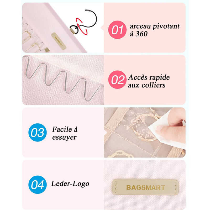 Il est conçu avec 36 poches transparentes pour contenir vos bagues, boucles d'oreilles, bracelets, montres, épingles à cheveux ou autres bijoux. [2 couleurs disponibles] Il y a 2 couleurs disponibles pour les organiseurs de voyage de bijoux : noir et rose. 36 crochets disponibles : l'organisateur de collier est conçu avec 3 rangées de crochets métalliques en forme de vague, qui peuvent être accrochés à 36 colliers... Poches en PVC humanisées : le support de rangement de bijoux dispose également de 39 poches pour ranger toutes sortes de bijoux tels que des bagues, des revenus, des épingles à cheveux, des bracelets. Design de rangement double face : cet organisateur de bijoux suspendu adopte un design double face pour fournir une grande capacité pour ranger vos gains, bagues, colliers et accessoires pour cheveux. Et l'autre côté peut stocker 39 colliers. Dimensions (L x l) : 82 x 36 cm., Poids : 0,4 kg. Le matériau en PVC transparent vous permet de reconnaître facilement chaque bijou, et le design indépendant de la grille vous permet de les trouver rapidement. Les crochets métalliques de l'organisateur de boucles d'oreilles sont durables et robustes, qui peuvent être accrochés au mur, à la porte et au placard. Il utilise également des sangles élastiques pour fixer les colliers sans trembler. Organisateur De Bijoux À Suspendre - Double Face 84 Poches SGTD Organisateur De Bijoux à Suspendre Double Face Avec Utilisations polyvalentes : les crochets métalliques de l'organisateur de boucles d'oreilles sont durables et robustes, qui peuvent être accrochés au mur, à la porte et au placard.