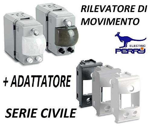 Exclusion manuel : allume et éteint la lumière deux fois en agissant sur l'interrupteur, les lampes resteront allumées pendant 6 heures, même si elles ne sont pas détectés mouvements. Détecteur de mouvement 3 modules pour série civile encastrée-PERRY... Détecteur de mouvement - PERRY ELECTRIC - à infrarouges passifs En reliant un interrupteur à détecteur de mouvement est possible de sélectionner : – Fonctionnement automatique : quand il détecte un mouvement et le niveau de luminosité de l'environnement est sous le niveau im PERRY ELECTRIC 1SPRM030A DÉTECTEUR MOUVEMENT 1 MODULE CIVILE Exclusion manuel : allume et éteint la lumière deux fois en agissant sur l'interrupteur, les lampes resteront allumées pendant 6 heures, même si elles ne sont pas détectés mouvements Le pilotage du relais avec logique Zero crossing optimise l'insertion du charge en augmentant la longévité des contacts. Les gradateurs postes sur le devant permettant le réglage de la durée d'allumage des lampes et du niveau de luminosité (lux) en dessous duquel le détecteur de mouvement doit comm