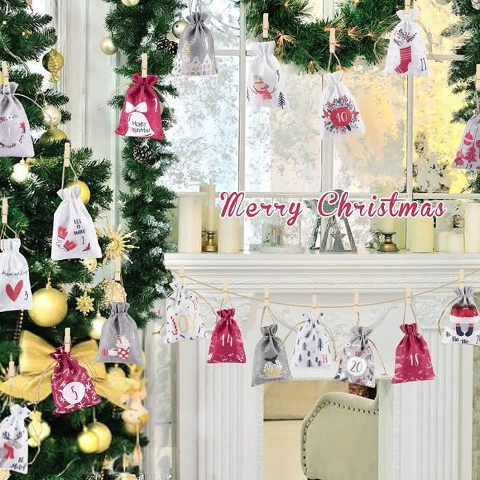 Parfait pour Noël, sapin de Noël, fête de Noël. Description de 24 sacs de Noël, calendrier de l'Avent, pochette à cordon, cadeau à suspendre 1. Design exquis et unique : 24 étiquettes autocollantes numérotées de 1 à 24, réutilisables chaque année, pour un calendrier toujours différent. 2. Fabriqué en lin, bambou, chanvre et bois de haute qualité, matériaux naturels, sûrs et agréables au toucher, sans odeur désagréable. 3... Cordon lumineux de Noël 3 pcs Rennes 229 LED Kit de équiper les guirlande, c'est aussi possible utilise dans la vie quotidien comme un sac de rangement. Petite Pochette Cadeau Noel YJZQ Sachets Pochette Cadeau Noël Sac Avec Cordon à Suspendre 24 Pcs Cadeau Invité Noel Idéal pour les adultes et les enfants : cachez-y de délicieux chocolats, des friandises, du rouge à lèvres, des cosmétiques et faites une petite surprise à vos proches sacs de calendrier: Décoration pour DIY, sac cadeau en tissu avec cordon de serrage avec autocollants pour sac à suspendre, facile à utiliser, léger, petit et joli. Multi application pour rangement: Pochettes résistant à l'usure qui sont Recycles et réutilisables pour faire une petiite économie.