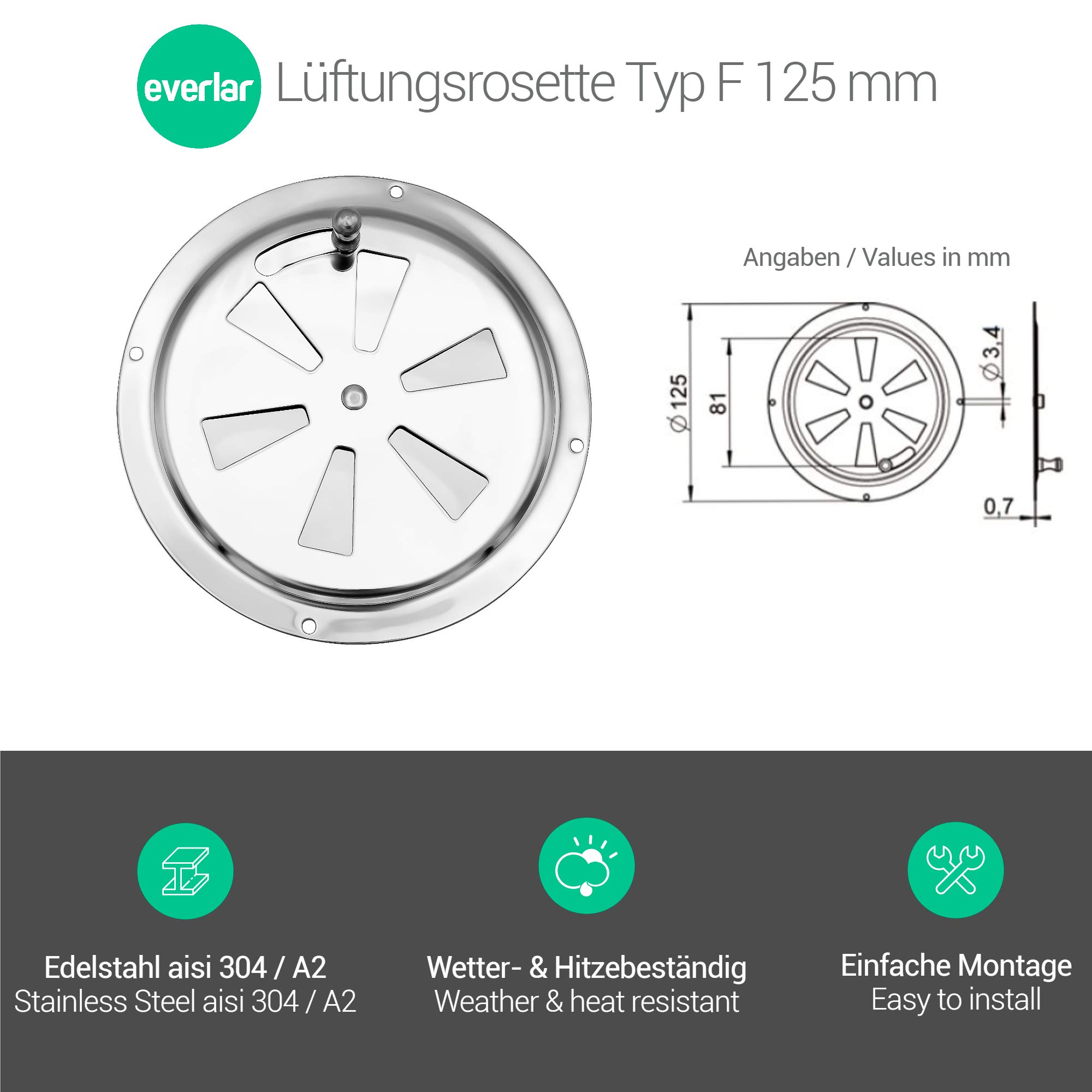 ROCA Grille de ventilation à lame en inox /125 mm ; PVC : 17,90 € ; seulement 16,95 € ; Vous économisez : 0,95 € ; Commande dans les 2 h 38 min, expédition aujourd... La grille d'aération verrouillable est en acier inoxydable poli, résistant aux intempéries et à la chaleur, qui peut également être utilisée pour la décoration. Convient pour l'aspiration intérieure et peut également être utilisé pour la décoration. Everlar Lot De 2 Rosaces D'aération En Acier Inoxydable 125 Mm I Tôle Nervurée De Qualité I Grille D'aération Pour Fumoir, Bateau, Camping-car, Maison, Etc. I Ventilateur Rond Verrouillable GRILLE DE CHAUFFAGE grille de ventilation grille d'évacuation tôle perforée aluminium argent - EUR 7,90.À VENDRE! Convient pour les fûts de barbecue, les tonneaux de feu, les fumeurs, les fûts d'encens, les bateaux, les camping-cars, les abris de jardin, les garages et tous les endroits où une ventilation en continu est nécessaire. Ces rosaces d'aération sont adaptées pour les fûts de barbecue, les tonneaux de feu, les fumeurs, les fûts d'encens, les bateaux de sport, les camping-cars, les abris de jardin, les garages et tous les endroits où une ventilation est nécessaire. BestFrance vous propose ce produit au meilleur prix Livraison Rapide Article en France Voir... Grille Ventilation ISpchen 2Pcs Rosaces De Ventilation En Acier Inoxydable,Panneau De D' Au00e9ration Ouvert Et Fermu00e9 De 12,7 Cm Plaque De Ventilation Ronde Grille De D'au00e9ration Pour Camping-Car,Bateau,Garage,Salle De Bain O Grill L'accessoire idéal pour tous ceux qui ont besoin d'une ventilation réglable, comme les professionnels du fumeur, les marins, les campeurs. Ils ont un diamètre de 125 mm et s'adaptent aux tuyaux d'aération jusqu'à 100 mm de diamètre, super faciles à monter. Die zwei Stege auf der Rückseite sorgen für einen optimalen Halt / Sitz in Türen, Arbeitsflächen, Fensterbänke, Schreibtische usw. Elle est équipée d'un mécanisme de verrouillage selon les besoins de ventilation, permet une arrivée d'air librement réglable ou peuvent être complètement fermées.