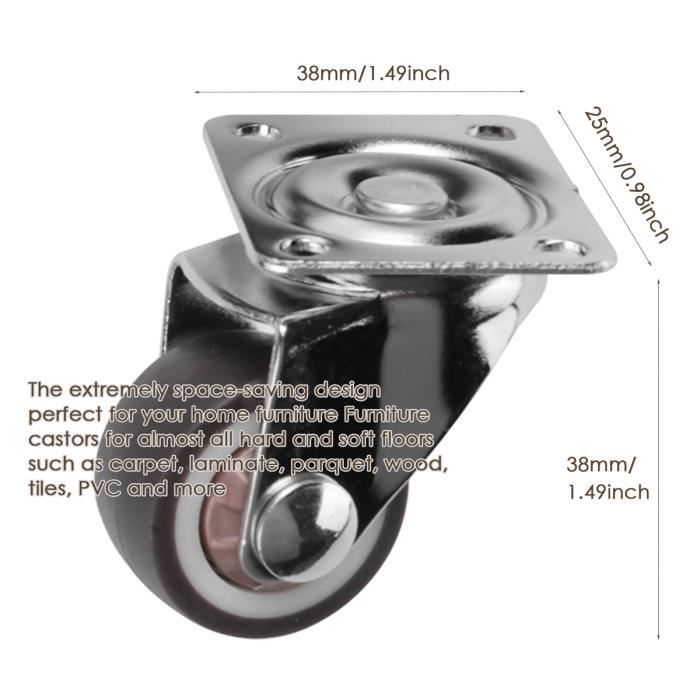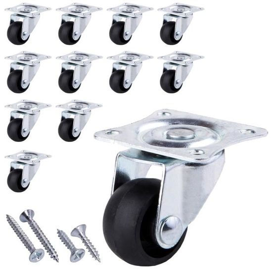 La position de la roue et les matériaux durables garantissent un roulement fluide et facile. ✔️ Je fournit des factures avec la TVA affichée séparément. SKIR'CO 4 Pièces Petites Roulettes De 25 Mm Pour Meubles Roues En Caoutchouc Non Pivotantes Roulettes Fixes Sens Unique Vis Incluses Roulettes Fixes Pour Meubles Lot De 12 Petites Roulettes En Caoutchouc 25 Mm Pour Meubles Non Roues Pour Meubles Idéal pour une grande variété d'utilisations Lot de mini-roulettes de 25 mm en caoutchouc et plastique fixées dans un écrin pivotant en métal - Pour meubles, appareils électro-ménagers et équipements La position de la roue et les matériaux durables... Ces roues en caoutchouc sont idéales pour une grande variété d'utilisations, du bricolage aux applications industrielles. Installation rapide et facile, aucune compétence particulière n'est nécessaire. Ces roulettes sont populaires pour les petits équipements et les meubles de petite taille, y compris les ottomans, les tables basses, les supports de plantes, les bacs à chaussures et à jouets, les établis, le rangement sous le lit, etc. Lot de 4 Roulettes Pivotantes Pour Meubles dont 2 avec Frein capacité 200 kg.