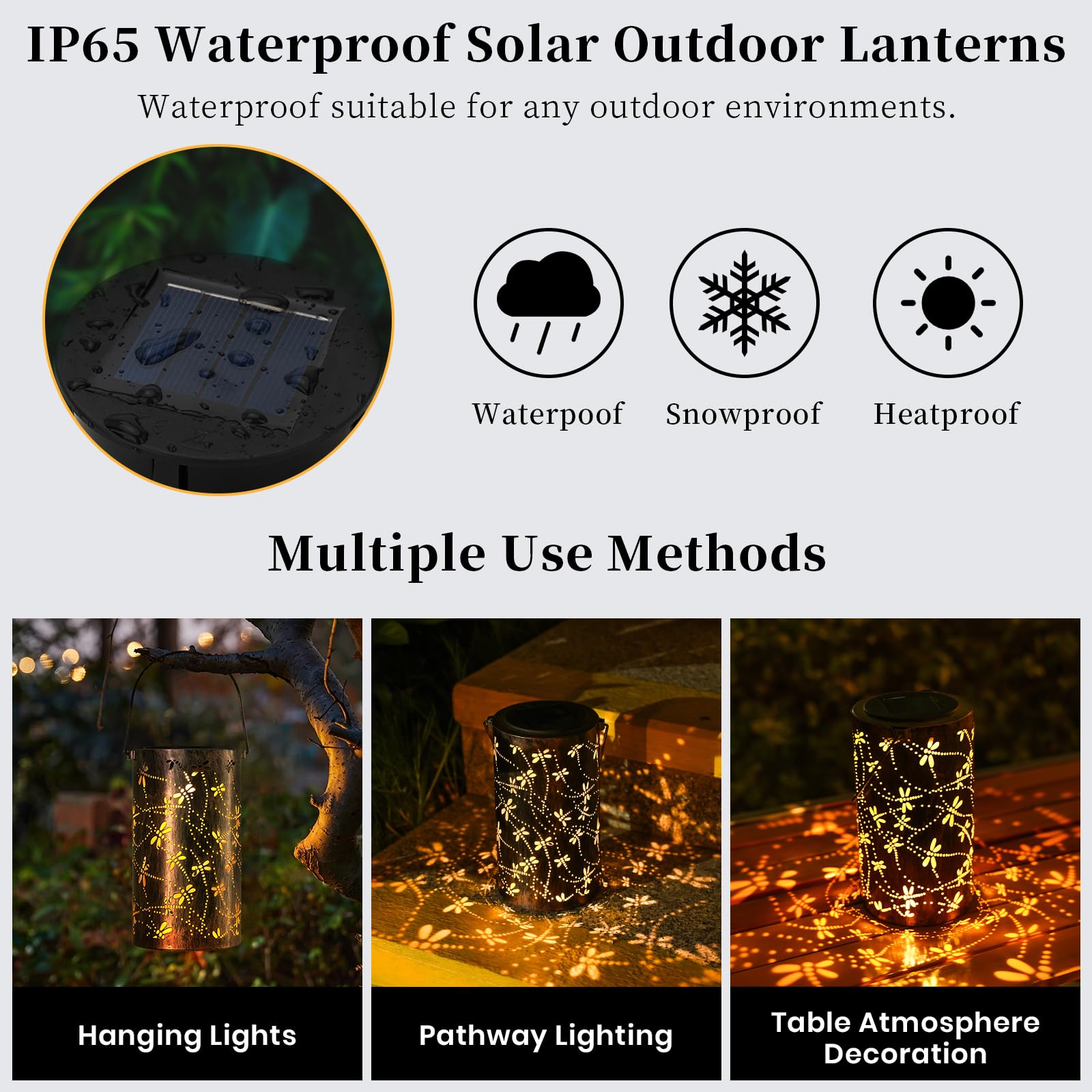La jolie projection de libellule donne vie à votre jardin. Instructions d'utilisation pratiques : il suffit de garder le bouton en position « ON », et les lanternes solaires d'extérieur étanches s'allument automatiquement à la tombée de la nuit. TSTR® Lanternes Solaires Décoratives Extérieures avec Éclairage Bougie... Cadeaux significatifs : la libellule transmet une vision positive de la vie et a une belle signification, de sorte que les cadeaux libellules pour femme sont des cadeaux significatifs pour maman, femme, grand-mère, sœur, tante, voisine ; il peut exprimer vos souhaits sincères et votre amour Les cadeaux de jardinage pour femme sont des cadeaux idéaux pour la famille et les amis pour les fêtes d'anniversaire, les pendaisons de crémaillère et diverses occasions festives., Rappel avant utilisation. Le design étanche permet aux lanternes solaires suspendues en plein air de résister à la plupart des conditions météorologiques. Les cadeaux libellules pour femme peuvent être accrochés dans le jardin, la cour, le balcon, la terrasse, le couloir et ainsi de suite. Cadeau de jardin idéal : nos cadeaux de jardinage pour femme peuvent non seulement être placés sur le sol comme une lumière d'allée nocturne, mais également accrochés dans les arbres, permettant à la libellule volante de servir de belle terrasse, porche, cour de décoration de jardin Décoration pour différentes occasions. Une lumière insuffisante peut raccourcir le temps d'utilisation. Lanterne Solaire d'Extérieur Motif Libellule – Natura Jardin Lanterne Solaire Exterieur Jardin à Poser Suspensions Solaires D'extérieur, Lanternes Décoratives En Métal Ajouré Suspension Solaire Exterieur Jardin Alimentation solaire durable : ces lanternes décoratives d'extérieur sont équipées d'un panneau solaire durable, qui prolonge le temps de veille ; les lanternes solaires suspendues d'extérieur disposent d'un design étanche, ce qui leur permet de fonctionner normalement même les jours de pluie