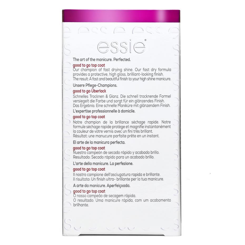 Ingrédients Ingrédients : acétate de butyle, acétate d'éthyle, acétate de cellulose, butyrate, isopropyle, alcool, triméthyle, pentanyl, diisobutyrate, acide adipique, néopentylglycol, anhydride trimélique, CI 60725/violet 2., Benzoph. Contenu : 1x Vernis à ongle Top Coat Essie, Teinte : Good To Go, Contenance : 13,5 ml LONDONTOWN Kur Protective Top Coat vernis de protection le top coat good to go d' offre un fini très glossy. il permet aussi de protéger vos ongles. il s'utilise pour toutes les couleurs de vernis . *selon le référentiel CITEO comprenant tous les éléments de l’emballage. Appliquez une base sur un ongle propre, puis laissez sécher Conseils d'application : Appliquer la base sur un ongle propre puis laisser sécher, Appliquer ensuite deux couches de vernis à ongles puis le top coat en finition, Pinceaux pratiques et précis pour une pose du vernis facile sans débordements Vs Speed Setter Essie STAY LONGER PREMIUM LONGWEAR TOP COAT - Vernis à Ongle Top Coat Vernis A Ongle Top Coat E4031f03g A11 Vernis Gel ENONE-1 DIMETHICONE Mode d'emploi 1., Appliquez la couche de base sur un ongle propre et laissez sécher., 2., Appliquez ensuite deux couches de vernis à ongles puis une couche de finition. Résultats : Pour une manucure parfaite prête en un instant, Tenue longue durée et fini ultra-brillant Avertissement De Sûreté Usage externe uniquement. Produits fréquemment achetés ensemble Cet article : Essie - Vernis à Ongles Top Coat - Teinte : Good To Go - 13.5 ml 1104€(817,78 €/l) Recevez-le En stock Expédié et vendu par . Essie Vernis de résultat professionnel Fuchsia et prune, effet semi-permanent, Angora Cardi, 13,5 ml 899€(8,99 €/unité) Recevez-le En stock Expédié et vendu par . 902...